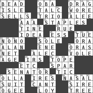 ACROSS 1. Necklace unit 5. Chief or king in Benin or Nigeria 8. To be drawn or hauled along 12. Small island 13. Baby powder 15. Had on 16. Makes a sale 18. Musical group of three 19. Toward shelter 20. Auto club (abbr.) 22. Paper fasteners 24. Prong on a fork 26. Sorrow 27. It may be bright or harebrained 28. Double-curved letter 29. Third day of the wk. 32. Words to Nanette 35. Not divided or shared with others 37. Mouth or opening 38. Actor Alda or Thicke 39. Compass dir. 40. Mouths or openings 41. Fish or hair follower 42. Actor Baldwin 43. Short-tailed, large-bodied rat 44. Ripen 45. Big collection agency 46. Drink excessively 49. And so on (abbr.) 50. Practice fight 51. Legislator 55. Nervous spasm 56. Water jar 57. Angers 59. Rhinal 63. Set or collection 64. Patter 65. The founder of a family 66. Double curve, resembling the letter S 67. Myrna of the movies 68. Relationship diagram DOWN 1. Twice 2. Compass dir. 3. Everything 4. Conveyance 5. Baseball player Mel 6. Soap units 7. Came down and settled, as after flight 8. A sleeping potion; an opiate (poet.) 9. Hero or heavy, e.g. 10. Ancient Greek god of war 11. Turn to the right 14. Rough 17. Stated 21. One (Scot) 23. Festering 25. Artist's stands 28. Opts 29. "Corrida" creature 30. Mountain range 31. Relaxation 32. Grandmother 33. Cassini of fashion 34. Nathan's nickname 36. Single 40. Cloudy 42. Northern region 45. Call ___ day 47. Choose 48. Ache 49. Maternal 51. A hard, heavy blow 52. Writer Wiesel 53. Taken by mouth 54. Former U.S. Attorney General Janet 56. Bear (Spanish) 58. Filthy place 60. Title for a knight 61. "We ___ not amused" (Victoria) 62. Area sheltered from the wind