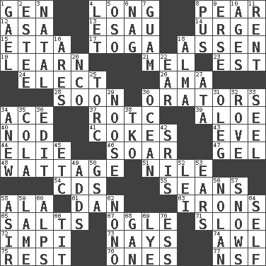 ACROSS 1. Commissioned mil. rank 4. Protracted 8. Lightbulb-shaped fruit 12. White ___ sheet 13. He sold his birthright 14. Goad 15. Singer James 17. Ancient Roman robe 18. NE Netherlands city 19. Acquire or gain knowledge or skills 21. Cartoonist voice _ Blanc 23. Eastern Standard Time (abbr.) 24. Choose 26. Nanny (var.) 28. Within a short period 30. Speakers 34. Adept person 37. College mil. group 39. Medicinal plant 40. Dreamland 41. Popular sodas 43. Night before a holiday 44. Writer Wiesel 46. Fly high 47. Set 48. Electrical Measurement 51. The longest river in the world 54. Music discs 55. Actors Connery and Penn 58. Chicken ___ king 61. One of the 12 tribes of Israel 63. Removes the wrinkles 65. Table seasonings 67. Stare at amorously 71. _ gin 72. Body of Kaffir warriors 73. Negative votes 74. Leather borer 75. Take ten 76. Washington bills 77. Science/research agcy. DOWN 1. Highlander 2. First name in cosmetics 3. Relating to or accompanying birth 4. Allow 5. Bear (Spanish) 6. Tired old horse 7. Island territory of the United States 8. Festering 9. Celtic language 10. Matures 11. Monthly bill 16. Ancient Greek god of war 18. _ mater 20. Non-commissioned officer (abbr.) 22. Hearing organ 25. Torque (variant) 27. _ moment's notice (2 wds.) 29. Trap for birds or small mammals 30. Sea 31. Cassini of fashion 32. Be footloose 33. Stitch closed the eyes of (a falcon) 34. Afresh 35. Root beer relative 36. Prepare for publication 38. Ring climax 42. Indian titles of respect 45. And so on (abbr.) 49. Does sums 50. Girls' org. (abbr.) 52. Luau accessory 53. Hearing organs 56. Pitcher Ryan 57. Frozen precipitation (plural) 58. SW Saudi Arabia district 59. Unable to walk 60. High mountains 62. Words to Nanette 64. Automatic 66. Teat (slang) 68. Separate the seeds from cotton 69. Sodium hydroxide 70. Curvy letter