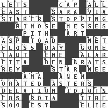 ACROSS 1. Allows 5. Head covering 8. Everything 11. 90 degrees 12. "Two Mules for Sister ____" 13. By way of 14. A viewer who gazes fixedly 17. Constricting 19. Full of chinks, cracks, or crevices 21. Makes clutter 22. Heart or essence 23. Tate display 24. Viper 27. Frog relative 29. Fish or hair follower 32. Soft thread for cleaning between teeth 34. 24 hours 36. Went 37. Drawn tight 38. Compass dir. 39. Having or resembling wings 40. Singer James 41. Lair 42. Naughty children 43. Marina Del _, California 44. Play the lead 46. Born 47. Wet nurse (var.) 50. Afresh 52. Spoke pompously 55. Michaelmas daisies 57. Accusation by an informer 59. Foolish or stupid persons 62. Begley and Asner 63. Round or rotation of duties 64. Become fatigued 65. "Barney Miller" actor Jack 66. Eastern Standard Time (abbr.) 67. Writer Wiesel DOWN 1. French article 2. Consume 3. Russian ruler of old 4. Empty completely 5. Feline 6. Odor 7. Some stationery 8. Advice 9. Actor's bit 10. Straggles 12. Compass dir. 15. Sends forth 16. Printing process, for short 18. Pacific Standard Time (abbr.) 20. Cast a shadow over 24. Following 25. Schedule 26. Marked by pouting 28. Natives or inhabitants of Denmark 29. Pitcher Ryan 30. Related on the mother's side 31. Laconic 33. R.R. building 35. Gossips 36. Slender fish 42. A special lineage 45. Opposed to 47. "One Day ___ Time" 48. Distance measurement (Brit.) 49. Goodbye (Sp.) 51. Compose 52. Lyric poems 53. Redecorate 54. In addition 55. Santa ___, CA 56. Land 58. Baseball player Mel 60. Three (prefix) 61. Observe