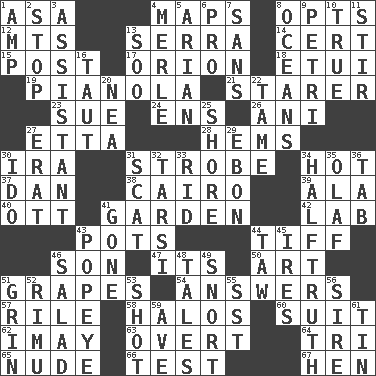 ACROSS 1. White ___ sheet 4. Atlas contents 8. Chooses 12. Mountains (abbr.) 13. Spanish missionary in California 14. Foregone conclusion 15. Mail 17. Constellation of myth 18. Needle holder 19. Player piano 21. A viewer who gazes fixedly 23. Take to court 24. Followers of ems 26. Black tropical American cuckoo 27. Singer James 28. Folds over and sews together 30. Retirement account (abbr.) 31. Disco prop 34. Being at a high temperature 37. One of the 12 tribes of Israel 38. Capital of Egypt 39. In the manner of 40. Baseball player Mel 41. Place where plants grow 42. Experiment locale 43. Cooking vessels 44. Small quarrel 46. Male offspring 47. It is 50. Nonscientific branch of learning 51. Wine fruits 54. Replies (to) 57. Cause heat under the collar 58. Radiant circles of light 60. Set of matching outer garments 62. "If ____ say so..." 63. Unconcealed 64. Three (prefix) 65. Naked 66. Trial 67. Layer DOWN 1. Electrical Unit 2. Halt 3. Helper 4. Haggard of country music 5. Believer in; advocate of (suffix) 6. Adept person 7. Without 8. Seas 9. _ dish (used to culture cells) 10. Loyal 11. Use a spoon 13. "Barney Miller" actor Jack 16. Pulled tight 20. Teachers' org. 22. Docile 25. Dinah or Pauly 27. Part of Q.E.F. 29. Inky black, to poets 30. Wedding promise 31. Scram, to a cat 32. Tarsus (plural) 33. To free from 34. Not exactly gospel 35. Norwegian king 36. Bar bill 41. Went 43. Wimpy's pal 44. The 23rd letter of the Hebrew alphabet 45. Angers 46. First course 48. Lies 49. Derisive sound 51. Amused look 52. Tall New Zealand timber tree 53. Went for two points 55. Fast jet (abbr.) 56. Father 59. "___ Maria" 61. Metal container