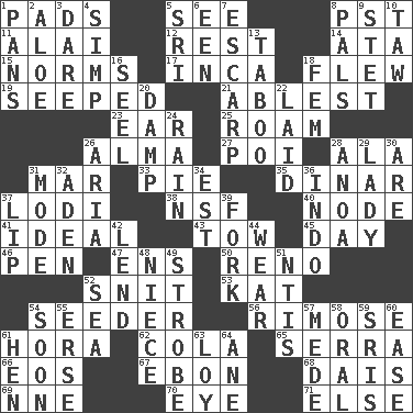 ACROSS 1. Groovy apts. 5. Observe 8. Pacific Standard Time (abbr.) 11. Jai ____ 12. Repose 14. "One Day ___ Time" 15. Typical models 17. South American Indian 18. Soared 19. Oozed 21. Most capable 23. Ewer handle 25. Wander aimlessly 26. _ mater 27. Luau course 28. According to 31. Third mo. 33. Sliced dessert 35. Middle Eastern gold or silver currency 37. Farming town in central California 38. Science/research agcy. 40. Connecting point 41. Standard of perfection 43. Pull behind 45. 24 hours 46. Animal enclosure 47. Followers of ems 50. Western Nevada city 52. In a ____ (agitated or irritated) 53. Krazy ___ of comics 54. Sowing specialist 56. Full of chinks, cracks, or crevices 61. Israeli folk dance 62. Root beer relative 65. Spanish missionary in California 66. Greek goddess of the dawn 67. Inky black, to poets 68. Raised platform 69. Compass dir. 70. Sight organ 71. Otherwise DOWN 1. Baking dishes 2. Medicinal plant 3. Have the gumption 4. Simple or foolish person 5. Indian title of respect (Mr.) 6. Car or cant ending 7. Fortification 8. Friends 9. Proofreading order 10. The 23rd letter of the Hebrew alphabet 13. Off limits 16. Stitch closed the eyes of (a falcon) 18. Opposite of masc. 20. Moist 22. Put down 24. Water falling in drops from the sky 26. Roberta Peters solo 28. Small Philippine buffalo 29. Kenny Rogers chart-topper in '80 30. "We ___ not amused" (Victoria) 31. Method 32. An important port of Yemen 34. Eastern Standard Time (abbr.) 36. _ china 37. Mouth edge 39. Tined utensil 42. Grant temporary use of 44. Put on (as clothing) 48. Sibling's daughter 49. Disco prop 51. Nuclear Threat Initiatives 52. Ocean 54. Within a short period 55. Celtic language 57. Ancient Persian 58. Relating to the mouth 59. Indian titles of respect 60. Relaxation 61. Layer 63. Myrna of the movies 64. A saturated hydrocarbon