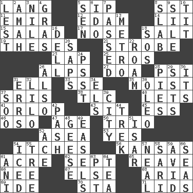 ACROSS 1. Long (Scottish) 5. Small drink 8. Fast jet (abbr.) 11. Arab leader 12. Dutch treat 14. Cards in a Roman deck? 15. Vegetable dish 17. Olfactory organ 18. Table seasoning 19. College papers 21. Disco prop 23. Infant locale 25. Greek god of love 26. High mountains 27. ___ good deed 28. Air pressure measure (abbr.) 31. Pipe bend 33. Compass dir. 35. Damp 37. Indian titles of respect 38. Affectionate concern, for short 40. Allows 41. Fourth or lowest deck 43. Be seated 45. Double-curved letter 46. Bear (Spanish) 47. Mature 50. Musical group of three 52. At sea 53. Consenting reply 54. Irritating cutaneous sensations 56. Sunflower state 61. 43,560 square feet 62. Back-to-school mo. 65. Break or tear apart 66. Born 67. Otherwise 68. Operatic vocal solo 69. Binary compound 70. R.R. building 71. Flaplike coverings DOWN 1. For fear that 2. Housemaid 3. The longest river in the world 4. Pate de foie ____ 5. Elected rep. 6. Wedding promise 7. Went by 8. Thick slice 9. Drop; flow; fall 10. Teat (slang) 13. Paris' subway 16. Small valley 18. Distress signal 20. Plant excrements 22. Wander aimlessly 24. Inconspicuous attention getter 26. In addition 28. Sliced desserts 29. Fast planes 30. ___ a Wonderful Life 31. Blunders 32. _ and Stitch 34. Raised railways 36. Margarine 37. "Barney Miller" actor Jack 39. Municipality 42. Romantic infatuation 44. Long journey 48. Honkers 49. Artist's stands 51. Austrian river, tributary to the Danube 52. Adept person 54. On the rocks 55. Relationship diagram 57. Anneal 58. Indian skirt 59. Enthusiastic 60. Oceans 61. Cuckoo 63. Pacific Standard Time (abbr.) 64. Beverage made from leaves