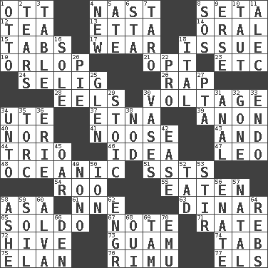 ACROSS 1. Baseball player Mel 4. Political cartoonist Thomas 8. Bristle 12. Beverage made from leaves 13. Singer James 14. Taken by mouth 15. Bar bills 17. Erode 18. Come out of 19. Lowest deck of a ship 21. Choose 23. And so on (abbr.) 24. Former Milwaukee Brewers owner Bud 26. Hit sharply and swiftly 28. Snakelike fish 30. Electrical Measurement 34. Shoshoni 37. Inactive volcano in Sicily 39. Soon (poet.) 40. Or not 41. Trap for birds or small mammals 43. Plus 44. Musical group of three 46. The content of cognition 47. Lion 48. Pertaining to the sea 51. Fast planes 54. Friend of Pooh 55. Consumed 58. White ___ sheet 61. Compass dir. 63. Middle Eastern gold or silver currency 65. Twentieth part of a lira 67. Musical sound 71. Pace 72. Hub of activity 73. Island territory of the United States 74. Keyboard key 75. Style 76. Tall New Zealand timber tree 77. Raised railways DOWN 1. "Beetle Bailey" pooch 2. Separates forcefully 3. Eating place 4. ___ Haven, CT 5. Had dinner 6. R.R. building 7. Pacific island yam 8. Mayday 9. Celtic language 10. Tense 11. Actor Baldwin 16. Flatfish 18. Slanted text style (abbr.) 20. Sliced dessert 22. Adept person 25. Small, secluded valley 27. Parent Teacher Assoc. 29. Unemotional 30. Flower holders 31. Of or related to the anus 32. Went 33. Inside; within (prefix) 34. To (old English) 35. Torque (variant) 36. 4th largest of the Great Lakes 38. Allow head to fall sleepily 42. Relaxation 45. Boat paddle 49. Words to Nanette 50. Electrically charged atom 52. Bit 53. Use a spoon 56. Related on the mother's side 57. Brizilian seaport 58. American tennis player Robert 59. Land 60. Inventor's middle name 62. Engineer (abbr.) 64. Confederate soldiers (slang) 66. Lair 68. Fr. "Yes" 69. Scottish cap 70. Australian flightless bird