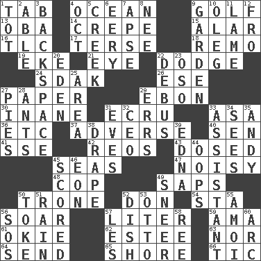 ACROSS 1. Keyboard key 4. Sea 9. Eighteen holes 13. Chief or king in Benin or Nigeria 14. Streamer paper 15. Having or resembling wings 16. Affectionate concern, for short 17. Laconic 18. San ____ (Riviera town) 19. Supplement with great effort 21. Sight organ 22. Evade 24. Neighbor of Neb. 26. Compass dir. 27. Some stationery 29. Inky black, to poets 30. Silly 31. Shade of tan 33. White ___ sheet 36. And so on (abbr.) 37. Contrary to your interests or welfare 40. Elected rep. 41. Compass dir. 42. Vintage cars 43. Administered medicine 45. Oceans 47. Annoyingly loud 48. Police officer (slang) 49. Plant excrements 50. Heavy duty weighing machine 52. Spanish title 54. R.R. building 56. Fly high 57. 61 cubic inches 59. Nursemaid (var.) 61. Migrant worker of the '30s 62. First name in cosmetics 63. And not 64. Post 65. Dinah or Pauly 66. Nervous spasm DOWN 1. Small child 2. Competent 3. Keyboard key 4. Sep. follower 5. Small stream 6. Suggestive of the supernatural 7. Domed church section 8. Born 9. Place where plants grow 10. Cassini of fashion 11. Unable to walk 12. From 20. Genesis locale 22. Alight from a bus 23. Bear (Spanish) 25. Type of rug 27. Sliced desserts 28. Pismires 29. Blunders 31. Nights before holidays 32. Corporate head (abbr.) 33. Helper 34. Perceives with the eye 35. "60 Minutes" Commentator Rooney 38. Window treatment 39. Pulitzer Prize-winning author Ferber 44. I made a mistake 45. Tallied 46. A really long time 49. Contemptuous expression 50. Casino tip 51. Precipitation 52. Food container 53. Von Bismarck 55. Mine, in Marseilles 56. Mayday 57. French article 58. To separate or throw off 60. Curve