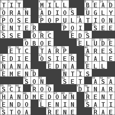 ACROSS 1. Teat (slang) 4. Place where flour is made 8. Necklace unit 12. Northwest Algerian city 14. Goodbye (Sp.) 16. Repulsive 17. Airs 18. Census information 20. Keyboard key 22. Luau course 23. Perceive with the eye 24. Compass dir. 25. The grampus (Milton) 28. Begley and Asner 30. Mitch Miller's instrument 31. Dodge 35. And so on (abbr.) 37. Canvas cover 40. Ancient Greek god of war 41. Singer Brickell 42. Flexible twig of a willow tree 44. Falsehood 45. Grandmother 46. Pulitzer Prize-winning author Ferber 47. Pipe bend 48. Make improvements or corrections to 50. Nuclear Threat Initiatives 52. Manchild 54. Put into a specified state 55. White ___ sheet 58. _-fi 61. Friend of Pooh 63. Middle Eastern gold or silver currency 65. Sleeping bag shop? 70. Monthly bill 71. Inside; within (prefix) 72. Soviet premier 1918-24 73. Suttee (variant) 74. Portico 75. French philosopher Descartes 76. Actress Charlotte DOWN 1. Drinks excessively 2. Removes the wrinkles 3. Clothes sense 4. Atlas unit 5. Wedding promise 6. Mouth edge 7. Central Nebraska county 8. Yet 9. Armor plate that protects the chest 10. _ vera 11. Centimeter-gram-second unit of force 13. Born 15. A type of plum 19. Helper 21. Director Reiner 26. Printing process, for short 27. Stop 29. Chalkboards 30. Seas 32. Mountain range 33. Small valley 34. Compass dir. 35. Dutch treat 36. Prong on a fork 38. To free from 39. Actor Sean's family 41. Compass dir. 43. Assign a rank or rating to 49. Dormintory (informal) 51. It would 53. Christmas carol 55. Approach 56. Before Barbara or Clara 57. Nick name for Arthur 58. "______ My Girl" (Turtles hit) 59. Patter 60. _ china 62. Baltic tributary 64. Big collection agency 66. ___ good deed 67. Single 68. Acquire through effort 69. Compass dir.