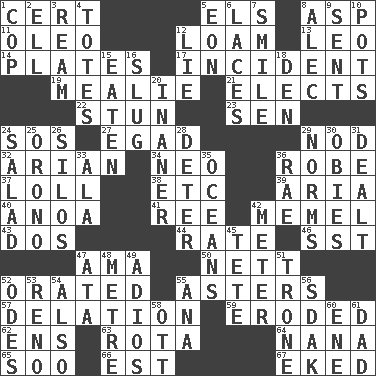 ACROSS 1. An absolute certainty 5. Raised railways 8. Cleo's killer 11. Butter sub 12. Rich soil 13. Lion 14. Food holders 17. Event 19. Ear of corn 21. Chooses 22. Make senseless or dizzy 23. Elected rep. 24. Mayday 27. Mild oath 29. Lower and raise head in agreement 32. Believer in; advocate of (suffix) 34. Modern: prefix 36. Loose flowing garment 37. Hang loosely or laxly 38. And so on (abbr.) 39. Roberta Peters solo 40. Small Philippine buffalo 41. To sift 42. Klaipeda city 43. Two (Sp.) 44. Pace 46. Fast jet (abbr.) 47. Wet nurse (var.) 50. Remaining after all deductions 52. Declaimed 55. Michaelmas daisies 57. Conveyance 59. Worn away 62. Followers of ems 63. Round or rotation of duties 64. Grandmother 65. "Barney Miller" actor Jack 66. Eastern Standard Time (abbr.) 67. Supplemented with great effort DOWN 1. Police officer (slang) 2. Pipe bend 3. 480, 500 or 516 sheets of paper 4. Hauls 5. Age 6. Shoestrings 7. Grin 8. Actor Baldwin 9. Transmitted 10. Plant holders 12. Untruth 15. Ingested 16. Snaillike creature with no shell 18. Lair 20. Sillier 24. First course 25. U. of Maine site 26. Grain storage towers 28. Prevent from occurring 29. Typical models 30. Off-Broadway awards 31. Started a card game 33. Insect wing 35. Seas 36. Actress Charlotte 42. Distance measurement 45. False hair 47. _ moment's notice (2 wds.) 48. Distance measurement (Brit.) 49. Goodbye (Sp.) 51. Heavy duty weighing machine 52. Lyric poems 53. Western Nevada city 54. In addition 55. Santa ___, CA 56. Neighbor of Neb. 58. Baseball player Mel 60. Compass dir. 61. June honoree