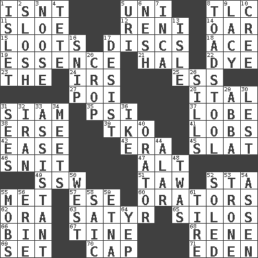 ACROSS 1. Is not 5. Single; one (prefix) 8. Affectionate concern, for short 11. A type of plum 12. Painter Guido (1575-1642) 14. Boat paddle 15. Plunders 17. Plates 18. Adept person 19. Substance 21. Actor Linden 22. Color 23. Definite Article 24. Big collection agency 25. Curvy letter 27. Luau course 28. Slanted text style (abbr.) 31. Thailand, formerly 35. 23rd letter of the Greek alphabet 37. Ear part 38. Celtic language 39. Ring climax 41. Tennis shots 42. Comfort 43. Epoch 45. Narrow board 46. In a ____ (agitated or irritated) 47. Keyboard modifier key 49. Compass dir. 51. The 23rd letter of the Hebrew alphabet 52. R.R. building 55. Was introduced to 57. Compass dir. 60. Speakers 62. Mouth or opening 63. Man with strong sexual desires 65. Grain storage towers 66. Storage container 67. Prong on a fork 68. French philosopher Descartes 69. Arrange properly for use 70. Head covering 71. Paradise DOWN 1. Small island 2. Make a splashing sound 3. Trap for birds or small mammals 4. Wig 5. RI univ. 6. Delicate 7. South American Indian 8. Inedible or poisonous agaric 9. Made of lace 10. Algonquian 13. Capri or Wright 16. Sever or remove by pinching or nipping 17. Stop 20. Riding implement 26. Beverly of Met fame 29. Swedish rock group 30. For fear that 31. Perceives with the eye 32. SW Asia republic 33. Helper 34. Confronts 36. Eisenhower's nickname 40. Speaker 44. Having or resembling wings 48. It was, poetically 50. Compass direction 52. Having a sole or soles 53. Marketplace scale 54. NE Netherlands city 55. Disorderly crowds 56. 4th largest of the Great Lakes 58. Ketch in the Levant 59. Inactive volcano in Sicily 61. Become fatigued 64. Slangy assent