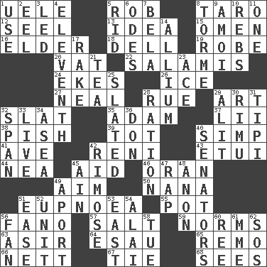 ACROSS 1. Ubangi River tributary 5. Director Reiner 8. Edible starchy tuberous root 12. Stitch closed the eyes of (a falcon) 13. The main thing one is thinking about 15. Sign of something about to happen 16. A person who is older than you are 18. Small valley 19. Loose flowing garment 20. Large container 22. Deli grouping 24. Makes supply last 26. Frozen water 27. Actress Patricia 28. Sorrow 29. Tate display 32. Narrow board 35. First man 37. Cards in a Roman deck? 38. Expression of disdain 39. Small child 40. Simple or foolish person 41. "___ Maria" 42. Painter Guido (1575-1642) 43. Needle holder 44. Teachers' org. 45. Assist 46. NW Algerian seaport 49. Direct toward a target or goal 50. Grandmother 51. Normal relaxed breathing 55. Cooking vessel 56. Papal veil 57. Table seasoning 59. Typical models 63. SW Saudi Arabia district 64. Son of Isaac 65. San ____ (Riviera town) 66. Remaining after all deductions 67. Standoff 68. Observes DOWN 1. Purpose 2. Snakelike fish 3. Directed 4. Veterans Day date 5. To free from 6. Lyric poems 7. Actor Lugosi 8. Singer Mel 9. Mine, in Marseilles 10. Confederate soldiers (slang) 11. Single 14. Plant genus of onion and garlic 17. Immoral or dissolute person 21. Afternoon social gathering 23. Adept person 25. Scheduled 28. Food allowance for one day 29. Came down and settled, as after flight 30. Tall New Zealand timber tree 31. Native american tent (variation) 32. Connect, as a bridge 33. Moving, as bait 34. Toward the sea 36. Spanish title 40. Elected representatives 42. Full of chinks, cracks, or crevices 45. The 18th letter of the Arabic alphabet 47. Reproach for some lapse or misdeed 48. At once, immediately (arch.) 49. To the left, to Queeg 51. Comfort 52. A single undivided whole 53. 90 degrees 54. Jai ____ 56. Air blower 58. Third day of the wk. 60. To separate or throw off 61. Madame (abbr.) 62. Mayday