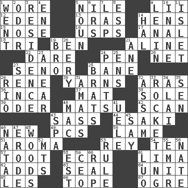 ACROSS 1. Had on 5. The longest river in the world 9. Cards in a Roman deck? 12. Locale of original sin 13. Mouths or openings 14. Coop moms 15. Characteristic smell of wine 16. United States Postal Service (abbr.) 17. Of or related to the anus 18. Three (prefix) 19. Benjamin's nick name 21. Place in a line 22. Have the gumption 24. Fenced enclosure 26. Fish or hair follower 27. Sir (Sp.) 28. Object of repulsion 29. French philosopher Descartes 30. Entertaining tales 32. Ancient river in northeast Turkey 36. South American Indian 37. Floor protector 38. Flatfish 39. Baltic tributary 40. Taiwanese island in East China Sea 42. Examine hastily 43. Backtalk 44. 1973 Nobel Price Winner (Physics) Leo 46. ___ Haven, CT 49. Personal Computers (abbr.) 50. Unable to walk 51. Scent 53. Marina Del _, California 54. "___ Little Indians" 57. A blast of a horn 58. Shade of tan 61. Pale green bean 62. Does sums 63. Lick closed 64. A single undivided whole 65. French article 66. Drink excessively 67. Legendary monster DOWN 1. Gone 2. Scent 3. Home 4. Compass dir. 5. Part of speech 6. Big collection agency 7. Infant locale 8. Double-curved letter 9. Soviet premier 1918-24 10. Lacking in sense or substance 11. Small island 14. Actor Linden 19. Sis' sibling 20. Suggestive of the supernatural 21. One (Scot) 23. Approach 24. Leg coverings 25. Followers of ems 27. Post 28. Naughty children 29. _ de Janeiro 31. Collect or gather 32. Indian state 33. Shooting up abruptly 34. Jai ____ 35. Elected rep. 40. Big _ 41. Ubangi River tributary 43. Health resort 45. Declare 46. Brizilian seaport 47. Wear away 48. Forest 52. Mountains (abbr.) 53. Governing power 55. Arab leader 56. Nathan's nickname 58. Eastern Standard Time (abbr.) 59. Corporate head (abbr.) 60. Hit sharply and swiftly 61. Nilotic language