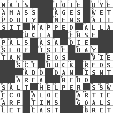 ACROSS 1. Floor protectors 5. Haul 9. Color 12. Collect or gather 14. Ripens 15. Dripping 16. Marked by pouting 17. Not women's 18. Keyboard modifier key 19. Be seated 20. Slept 23. Silent film actress Nazimova 24. Southern CA. univ. 25. Celtic language 27. Friends 30. White ___ sheet 32. Expire 33. _ gin 34. Small island 36. 24 hours 38. The 23rd letter of the Hebrew alphabet 39. Greek goddess of the dawn 40. Compete 43. _-fi 46. Evade 48. Vintage cars 49. Say or write further 51. One of the 12 tribes of Israel 52. Is not 53. Type of rug 54. Make new 56. Table seasoning 58. Aide 61. Compass dir. 64. Environmental prefix 65. Medicinal plant 66. Nick name for Arthur 68. Sandy's bark 69. Canisters 70. Finish lines 71. Allow 72. 90 degrees 73. Cy Young winner Saberhagen DOWN 1. Atlas contents 2. Mine, in Marseilles 3. Strained 4. Fast jet (abbr.) 5. Pack (down) 6. Double curve, resembling the letter S 7. Looked after 8. Double-curved letter 9. A sleeping potion; an opiate (poet.) 10. Shout 11. Singer James 13. Synchronize (abbr.) 21. Jai ____ 22. Went by 23. Toward the sea 24. Purpose 26. To free from 27. Pacific Standard Time (abbr.) 28. Insect wing 29. Moos 31. Verbally 35. Fortification 37. Jacques Cousteau's middle name 41. Electrically charged atom 42. Eastern Standard Time (abbr.) 44. Heavy open wagon 45. Binary compound 47. Leg joint 48. _ de Janeiro 50. Mexican or Central American flower 53. High up in or into the air 55. To trail on the ground 56. Lick closed 57. Measure of real estate 59. Immeasurably long periods of time 60. For fear that 61. Play the lead 62. Filth; sediment 63. Compass direction 65. Had dinner 67. Director Reiner