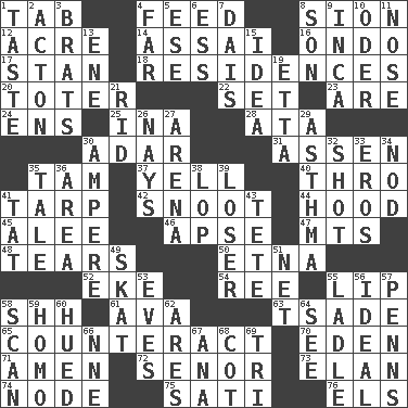 ACROSS 1. Keyboard key 4. Nourish 8. The Jewish people; Israel 12. 1/640 square mile 14. Slender Brazilian palm 16. Southwest Nigerian state 17. Comedian Laurel of Laurel & Hardy 18. Homes 20. Carrier 22. Put into a specified state 23. "We ___ not amused" (Victoria) 24. Followers of ems 25. _ tizzy (2 wds.) 28. "One Day ___ Time" 30. The sixth month of the Jewish calendar 31. NE Netherlands city 35. Scottish cap 37. Shout 40. Through, poetically 41. Canvas cover 42. Snob 44. Parka part 45. Toward shelter 46. Domed church section 47. Mountains (abbr.) 48. Rends 50. Inactive volcano in Sicily 52. Make supply last 54. To riddle 55. Mouth edge 58. Quiet! 61. Actress Gardner 63. Sadhe (variant) 65. Frustrate 70. Locale of original sin 71. So be it 72. Sir (Sp.) 73. Enthusiasm 74. Thickened enlargement 75. Suttee (variant) 76. Raised railways DOWN 1. Clothes sense 2. NE Massachussets city 3. Naughty children 4. At a great distance 5. Compass dir. 6. Curvy letter 7. Raised platform 8. Boy, to dad 9. South American Indian 10. Baltic tributary 11. Sense of smell 13. Compass dir. 15. The content of cognition 19. Singer James 21. To free from 26. Negative votes 27. Sports stadium 29. Respiratory problem 30. Electrical Unit 32. Attempt 33. Greek god of love 34. Allow head to fall sleepily 35. Lie 36. Length times width 38. Chop off 39. Failure 41. Make lace 43. False hair 49. Three-handed card game 51. Fish or hair follower 53. Nights before holidays 55. Dipping utensil 56. Standard of perfection 57. Actor Sean's family 58. Examine hastily 59. Like (prefix) 60. Took on color 62. Ancient Greek god of war 64. Perceive with the eye 66. Compass dir. 67. Santa ___, CA 68. Small bed 69. Three (prefix)