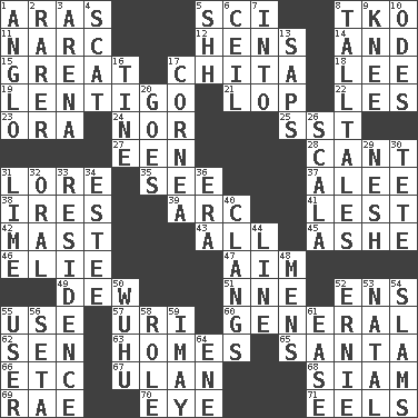 ACROSS 1. Caspian sea tributary 5. _-fi 8. Ring climax 11. Drug cop 12. Coop moms 14. Plus 15. Relatively large 17. Riviera of "Kiss of the Spider Woman" 18. Area sheltered from the wind 19. Small, flat, pigmented spot on the skin 21. Trim (branches) 22. French article 23. Mouth or opening 24. Not either 25. Fast jet (abbr.) 27. Car or cant ending 28. Patter 31. Old wives' tales, e.g. 35. Perceive with the eye 37. Toward shelter 38. Angers 39. Curve 41. For fear that 42. Vertical spar for supporting sails 43. Everything 45. American tennis player Robert 46. Writer Wiesel 47. Direct toward a target or goal 49. Morning condensation 51. Compass dir. 52. Followers of ems 55. Purpose 57. RI univ. 60. Commissioned military rank 62. Elected rep. 63. Residences 65. Before Barbara or Clara 66. And so on (abbr.) 67. ____ Bator 68. Thailand, formerly 69. Actress Charlotte 70. Sight organ 71. Snakelike fish DOWN 1. White American of non-Hispanic descent 2. More uncommon 3. Sports stadium 4. Go away! 5. Quiet! 6. To provide with a ceiling 7. To the inside or interior of 8. Baron Munchausen's specialties 9. Leg joint 10. Lyric poems 13. Plant excrements 16. Prong on a fork 17. Pupil covering 20. Leaves 26. Any of the three canals of the cochlea 29. Tender 30. Wig 31. Welles in "The Third Man" 32. Of the mouth 33. Home 34. First name in cosmetics 36. Period 40. Rigngs loudly 44. Actor's bit 48. Not women's 50. Chinese city south-southwest of Nanjing 52. Bert's buddy 53. Relating to or accompanying birth 54. Shuts with force 55. One who uses or employs something 56. Bristle 58. Hero or heavy, e.g. 59. "If ____ say so..." 61. Relaxation 64. Compass dir.