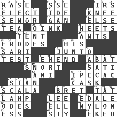 ACROSS 1. To erase 5. Compass dir. 8. Big collection agency 11. Voters do this 13. Binary compound 14. Leg joint 15. Sir (Sp.) 16. Separate the seeds from cotton 17. Otherwise 18. Afternoon social gathering 19. Pig sound 21. Confronts 22. Portable shelter 24. Pismires 25. Eats (away) 27. Part of HMS, perhaps 29. Indian skirt 30. Secret group 32. Trial 33. Make improvements or corrections to 35. Blind as ____ 39. Derisive sound 41. Suttee (variant) 42. Black tropical American cuckoo 43. Medicinal drug used to evoke vomiting 45. Comedian Laurel of Laurel & Hardy 48. Keg 49. Any of the three canals of the cochlea 50. Cy Young winner Saberhagen 52. Make lace 55. Desk light 56. Area sheltered from the wind 57. Peak District village in England 59. Lyric poems 60. Pipe bend 61. High-strength synthetic material 62. Curvy letter 63. Filthy place 64. Made supply last DOWN 1. Remainder 2. Toward shelter 3. Elected representatives 4. Environmental prefix 5. Attach a signature 6. Neighbor of Neb. 7. Car or cant ending 8. An arm off of a larger body of water 9. Musical pauses 10. Perceives with the eye 12. Heavy duty weighing machine 14. Peachy ____! 20. ___ a Wonderful Life 21. Vertical spar for supporting sails 23. Proofreads 25. Eastern Standard Time (abbr.) 26. Actress Charlotte 27. Attila the _ 28. Working for oneself (abbr.) 30. Passenger plane 31. Fertile tracts in a desert 33. Period of immesurable duration 34. Medical imaging device (abbr.) 36. Sass 37. "One Day ___ Time" 38. Nervous spasm 40. Grandmother 43. Frozen water 44. Eucharist need 45. Loads 46. Corrects by punishment or discipline 47. High mountains 49. A type of plum 50. Waist strap 51. Depend 53. _ vera 54. Be inclined (to) 56. French article 58. Color