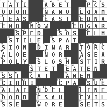 ACROSS 1. Jacques of French films 5. Collude with 9. Personal Computers (abbr.) 12. Aroma 13. Billionth: prefix 14. Rich soil 15. Afternoon social gatherings 16. 90 degrees 17. Pulitzer Prize-winning author Ferber 18. Conclusion 19. Cut the grass 21. _ Allan Poe 22. Moved rapidly 24. Mayday 26. Shade tree 27. Vertical member of a panel or frame 28. Argument over a trivial matter 29. The Jewish people; Israel 30. Middle Eastern gold or silver currency 32. Torque (variant) 36. _ vera 37. And not 38. Toward the sea 39. Much (prefix) 40. Splash clumsily 42. Use a spoon 43. Proofreading order 44. Consumed 46. Fast jet (abbr.) 49. Feline 50. So be it 51. High-altitude cloud 53. Numbers guy (abbr.) 54. Take to court 57. Jai _ 58. Christmas carol 61. Actor's bit 62. Texas town _ City 63. He sold his birthright 64. Morally bad or wrong 65. Compass dir. 66. Had on 67. Puts into a specified state DOWN 1. Haul 2. An important port of Yemen 3. Inedible or poisonous agaric 4. Big collection agency 5. Afresh 6. Sound made by sheep 7. Followers of ems 8. Small child 9. Puddle 10. Lessep's creation 11. Excessive but superficial compliments 14. Directed 19. Cartoonist voice _ Blanc 20. Wrote a lyric poem 21. Eastern Standard Time (abbr.) 23. Abounding in pines 24. Practice fights 25. Rowing implement 27. Grain storage tower 28. Snob 29. Plant excrement 31. An arm off of a larger body of water 32. Clothes sense 33. Clearly or manifestly demonstrative 34. It's straight from the horse's mouth 35. Auto 40. R.R. building 41. Pile 43. _-fi 45. Housemaid (var.) 46. Heaps 47. Grain storage towers 48. Swap 52. To free from 53. A slight indication 55. A single undivided whole 56. Snakelike fish 58. ___ Haven, CT 59. Bear (Spanish) 60. Ewer handle 61. French article