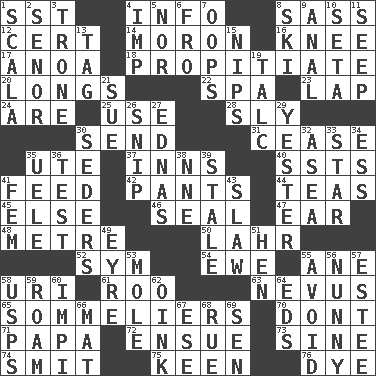ACROSS 1. Fast jet (abbr.) 4. Information 8. Backtalk 12. Sure thing 14. Person of subnormal intelligence 16. Leg joint 17. Small Philippine buffalo 18. Conciliate 20. Yearns 22. Health resort 23. Infant locale 24. "We ___ not amused" (Victoria) 25. Purpose 28. Cunning 30. Post 31. Desist 35. Shoshoni 37. Taverns 40. Fast planes 41. Nourish 42. Leg coverings 44. Afternoon social gatherings 45. Otherwise 46. Lick closed 47. Hearing organ 48. Distance measurement (Brit.) 50. Cowardly lion portrayer 52. Symbol (abbr.) 54. She-sheep 55. One (Scot) 58. RI univ. 61. Friend of Pooh 63. Congenital growth or mark on the skin 65. Wine waiters 70. Do not 71. Dad 72. Take place subsequently 73. Trig term 74. Stricken, poetically 75. Peachy ____! 76. Color DOWN 1. Any of the three canals of the cochlea 2. Sir (Sp.) 3. Heavy duty weighing machine 4. Mischievous child 5. Or not 6. Away 7. I made a mistake 8. What Jean-Claude Killy likes to do 9. Of or related to the anus 10. Bristle 11. Ooze 13. Label 15. Cuts off 19. Baby powder 21. Take to court 26. Clip 27. Ferber et al. 29. Of or pertaining to yesterday 30. Spring feasts 32. At sea 33. Play the lead 34. Double-curved letter 35. Ubangi River tributary 36. Trial 38. Compass dir. 39. Showing deterioration from age 41. Opposite of masc. 43. Cole _ (cabbage dish) 49. Jane of fiction 51. Layer 53. Undercover agent 55. Prevent from happening 56. Pet term 57. First name in cosmetics 58. United States Postal Service (abbr.) 59. Wander aimlessly 60. Body of Kaffir warriors 62. Pig sound 64. Begley and Asner 66. Floor covering 67. Compass dir. 68. Regret 69. Elected rep.