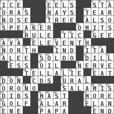 ACROSS 1. Frozen water 4. Snakelike fish 8. R.R. building 11. Mouths or openings 13. Negative votes 14. Separate forcefully 15. Olfactory organ 16. Woody plant 17. In addition 18. Orator 21. Leaves out 22. Governing power 23. Nervous spasm 25. Turn to the right 26. Actress Gardner 29. Veterans Day date 32. 0 degrees 34. Working for oneself (abbr.) 35. Call ___ day 38. Toward shelter 39. Twentieth part of a lira 41. Deli pickle 43. Curvy letter 44. Petroleum 45. Impudent aggressiveness 46. Copy Pinocchio 50. Ingest 51. Spanish title 54. Music discs 55. Mountain range 57. U. of Maine site 59. Deli grouping 63. Claim 64. Vertical spar for supporting sails 67. Greater amount 68. Eighteen holes 69. Having or resembling wings 70. Style 71. Compass dir. 72. Dad 73. Conclusion DOWN 1. Charged atoms 2. Riding implement 3. Comfort 4. Main course 5. Ewer handle 6. Sodium hydroxide 7. Compass dir. 8. Former Milwaukee Brewers owner Bud 9. Clothes sense 10. Came up 12. Dry up 14. Scottish cap 19. Malaysian steamed pastry 20. Pipe bend 21. Sep. follower 23. Be inclined (to) 24. Southeast Asian peninsula 26. Santa ___, CA 27. Grand slam 28. Ancient Greek god of war 30. Country estate 31. Flintstone garb 33. Trial 36. Hoop that covers a wheel 37. Inventor's middle name 39. Disposed of to a purchaser 40. Lubricates 42. Allow 45. Be tempered by heat 47. Environmental prefix 48. A period of five years 49. Retirement account (abbr.) 51. Evade 52. Constellation of myth 53. Impressive in appearance 56. Unable to walk 58. Overdraft (abbr.) 60. Undercover agent 61. SW Asia republic 62. Post 64. Atlas unit 65. In the manner of 66. Plant excrement