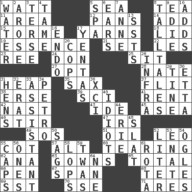 ACROSS 1. Electrical Unit 5. Ocean 8. Afternoon social gathering 11. Length times width 12. Zero-star reviews 14. Find the sum of 15. Singer Mel 17. Tall tales 18. Flaplike covering 19. Substance 21. Arrange properly for use 22. French article 23. To sift 24. Spanish title 25. Be seated 27. Elect 28. Nathan's nickname 31. Pile 35. Saxophone 37. Secret move to avoid paying debts 38. Celtic language 39. _-fi 41. Monthly bill 42. Political cartoonist Thomas 43. Binary compound 45. At sea 46. Disorderly outburst 47. Big collection agency 49. Distress signal 51. Petroleum 52. Lion 55. Small bed 57. Keyboard modifier key 60. Pulling apart 62. Santa ___, CA 63. Brides' dresses 65. Add up to 66. Animal enclosure 67. Connect, as a bridge 68. Wig 69. Fast jet (abbr.) 70. Compass dir. 71. Ancient Greek god of war DOWN 1. Wetness 2. Came up 3. Laconic 4. Not wild 5. Health resort 6. Hearing organs 7. Queen of England 1702-14 8. Baron Munchausen's specialties 9. Singer Brickell 10. Does sums 13. Fast planes 16. Inside; within (prefix) 17. Gossips 20. 911 reaches them 26. Kind of red light 29. Prong on a fork 30. Singer James 31. Coop moms 32. Part of Q.E.F. 33. Aide 34. Stone: prefix 36. One more than ninety 40. Foolish or stupid persons 44. 4th largest of the Great Lakes 48. Narrow board 50. Settles 52. 61 cubic inches 53. Maternal 54. Stares at amorously 55. Smile enhancers 56. Singles 58. Chops off 59. It was, poetically 61. Round or rotation of duties 64. Compass dir.