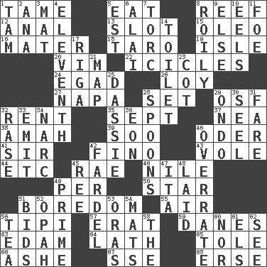 ACROSS 1. Docile 5. Ingest 8. Coral ridge 12. Of or related to the anus 13. Slit 15. Butter sub 16. Mother 18. Edible starchy tuberous root 19. Capri or Wright 20. Zeal 22. Winter's stalactites 24. Mild oath 26. Myrna of the movies 27. California wine valley 28. Put into a specified state 29. Order of Saint Francis (abbr.) 32. Monthly bill 35. Back-to-school mo. 37. Teachers' org. 38. Housemaid 39. "Barney Miller" actor Jack 40. River in Europe 41. Title for a knight 42. A pale, very dry sherry 43. Grand slam 44. And so on (abbr.) 45. Actress Charlotte 46. "Death on the ____" 49. For each 50. Play the lead 51. Mood resulting from idleness 55. Wind 56. Native american tent (variation) 57. Part of Q.E.F. 59. Natives or inhabitants of Denmark 63. Dutch treat 64. Thin strip of wood or metal 65. Lacquered or enameled metalware 66. American tennis player Robert 67. Compass dir. 68. Celtic language DOWN 1. Scottish cap 2. Santa ___, CA 3. Floor covering 4. Veterans Day date 5. Eastern Standard Time (abbr.) 6. Jai _ 7. Torque (variant) 8. Agitated, as a liquid 9. Otherwise 10. Snakelike fish 11. Enemy 14. Bathroom plumbing fixture 17. Port city in Latvia 21. Atlas unit 23. Small bed 25. Hyrax 28. Soup utensils 29. Southwest Nigerian state 30. Stitch closed the eyes of (a falcon) 31. Conductor's collection 32. Raze (variant) 33. Give off 34. Drug cop 36. Period of immesurable duration 40. Make much ado about nothing 42. Pack 45. To sift 47. Call ___ day 48. Put down 49. A-one 51. Auction offers 52. Brightly colored fish 53. Mouths or openings 54. Floor protectors 56. Afternoon social gathering 58. Definite Article 60. And not 61. Raised railways 62. Perceive with the eye