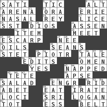 ACROSS 1. Suttee (variant) 5. Nervous spasm 8. Keyboard modifier key 11. Sports stadium 13. Mouth or opening 14. One of the Great Lakes 15. Rhinal 16. Marina Del _, California 17. Louse (plural) 18. Fast jet (abbr.) 19. "Vaya con ____" 21. NE Netherlands city 22. A whole individual unit 24. Rendezvous 25. Fortification 27. Born 29. Lubricates 30. Seines 32. Proofreading order 33. Peter (Polish) 35. Lie 39. Prepares for publication 41. Sign of something about to happen 42. It is so 43. Slept 45. False hair 48. Domed church section 49. First course 50. Engineer (abbr.) 52. To free from 55. Collude with 56. Erode 57. Feeling or showing extreme anger 59. Locales 60. _ Lanka 61. Utah city north of Ogden 62. Small child 63. Curvy letter 64. Waist strap DOWN 1. Without 2. Caspian sea tributary 3. A testis 4. _ tizzy (2 wds.) 5. "Corrida" creature 6. Angers 7. Island 8. Ascend 9. It is permitted: Lat. 10. Adolescent 12. Tree or shrub in the Birch family 14. Otherwise 20. Naughty child 21. So be it 23. Clothes sense 25. Greek goddess of the dawn 26. Be seated 27. Fish or hair follower 28. Ewer handle 30. Distress signal 31. Closes up, plugs up 33. Sliced dessert 34. ___ a Wonderful Life 36. Electrical Measurement 37. Area sheltered from the wind 38. Conclusion 40. Colored 43. Tired old horse 44. Showery time 45. Off limits 46. Voters do this 47. Jacques of French films 49. Table seasoning 50. Hearing organs 51. Nuclear Threat Initiatives 53. Slanted text style (abbr.) 54. Scratch 56. Compass dir. 58. Director Reiner