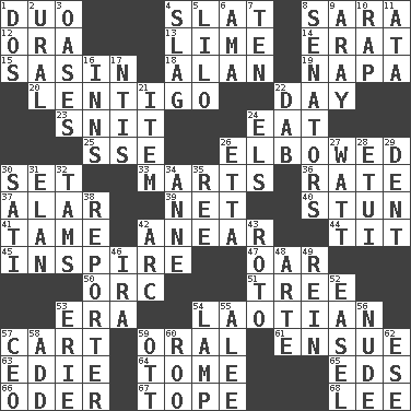 ACROSS 1. Superhero pair 4. Narrow board 8. "Two Mules for Sister ____" 12. Mouth or opening 13. Welles in "The Third Man" 14. Part of Q.E.F. 15. Indian antelope 18. Actor Alda or Thicke 19. California wine valley 20. Small, flat, pigmented spot on the skin 22. 24 hours 23. In a ____ (agitated or irritated) 24. Erode 25. Compass dir. 26. Shoved, as through a crowd 30. Put into a specified state 33. Shops 36. Assign a rank or rating to 37. Having or resembling wings 39. Fish or hair follower 40. Make senseless or dizzy 41. Not wild 42. Approach 44. Teat (slang) 45. Stimulate to action 47. Boat paddle 50. The grampus (Milton) 51. Relationship diagram 53. Epoch 54. Of or relating to Laos or its people 57. Heavy open wagon 59. Relating to the mouth 61. Follow as a consequence or result 63. Singer Brickell 64. Heavy book 65. Begley and Asner 66. River in Europe 67. Drink excessively 68. Area sheltered from the wind DOWN 1. Two (Sp.) 2. Mountain range 3. Fertile tracts in a desert 4. Volcanic refuse 5. _ and Stitch 6. Housemaid (var.) 7. "___ Little Indians" 8. Elected representatives 9. Like ___ of sunshine 10. Hit sharply and swiftly 11. "One Day ___ Time" 16. Restaurants 17. Nuclear Threat Initiatives 21. Detail 22. Apply (a substance) by light strokes 24. Raised railways 26. Singer James 27. Electrical Unit 28. Needle holder 29. Gouge 30. Suttee (variant) 31. Style 32. Scottish caps 34. Queen of England 1702-14 35. Portuguese money of account (variant) 38. News announcer 42. Curve 43. Printing process, for short 46. Retirement account (abbr.) 48. Johnson of "Laugh-In" 49. It's straight from the horse's mouth 52. Artist's stand 53. 4th largest of the Great Lakes 54. Desk light 55. Toward shelter 56. Unadorned 57. Corporate head (abbr.) 58. Find the sum of 59. Baseball player Mel 60. Friend of Pooh 62. Compass dir.
