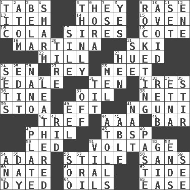 ACROSS 1. Bar bills 5. Those people 9. To erase 13. A distinct part 14. Flexible conduit 15. Baking chamber 16. Root beer relative 17. Founders of families 18. ____ d'Azur (French Riviera) 19. Chrissie's court nemesis 21. What Jean-Claude Killy likes to do 22. Place where flour is made 23. Took on color 24. Elected rep. 27. Marina Del _, California 28. Confront 29. Peak District village in England 31. Nine, plus one 32. Angers 36. Prong on a fork 37. Petroleum 38. Remaining after all deductions 39. Portico 40. Lizard (obsolete) 41. Group of southern Bantu languages 42. Not kosher 44. American Automobile Association (abbr.) 46. Soap unit 47. Silvers or Donahue 48. Cook's measure (abbr.) 50. Directed 51. Electrical Measurement 54. The sixth month of the Jewish calendar 56. Vertical member of a panel or frame 58. Without 60. Nathan's nickname 61. Spoken 62. Periodic rise and fall of the sea level 63. Colored 64. Lubricates 65. Relaxation DOWN 1. Nervous spasm 2. Smallest unit of an element 3. Actor Lugosi 4. Excessive but superficial compliments 5. Without thickness 6. Israeli folk dance 7. Compass dir. 8. Affirmative reply 9. Shooting up abruptly 10. Stay clear from 11. Put into a specified state 12. Compass dir. 17. Filth; sediment 20. Hoop that covers a wheel 21. Take to court 23. Layer 24. Arranges properly for use 25. Prepare for publication 26. Billionth: prefix 28. Cartoonist voice _ Blanc 30. Resembling or made to resemble leather 31. Teat (slang) 33. Reuben's nickname 34. Inactive volcano in Sicily 35. Use a swizzle stick 37. No longer planned or scheduled 40. Snakelike fish 41. Political cartoonist Thomas 43. To free from 44. Ringlike coral islands and reefs 45. Competent 47. Food holder 49. Thick mixture 51. Small bottle 52. Greek goddess of the earth (variant) 53. Conclusions 54. Plus 55. 24 hours 56. "Barney Miller" actor Jack 57. Three (prefix) 59. Perceive with the eye