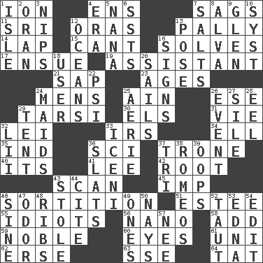 ACROSS 1. Electrically charged atom 4. Followers of ems 7. Sinks 11. _ Lanka 12. Mouths or openings 13. Friendly 14. Infant locale 15. Patter 16. Finds the solution 17. Take place subsequently 19. Helper 21. Plant excrement 23. Eons 24. Not women's 25. The 18th letter of the Arabic alphabet 26. Compass dir. 29. Tarsus (plural) 30. Raised railways 31. Compete 32. Flowery wreath 33. Big collection agency 34. Pipe bend 35. Indiana (abbr.) 36. _-fi 37. Heavy duty weighing machine 40. ___ a Wonderful Life 41. Area sheltered from the wind 42. Carrot, for example 43. Examine minutely or intensely 45. Naughty child 46. Drawing lots 51. First name in cosmetics 55. Foolish or stupid persons 56. Billionth: prefix 58. Increase 59. Having high moral qualities 60. Snake ____ (dice throw) 61. University (slang) 62. Celtic language 63. Compass dir. 64. Make lace DOWN 1. Capri or Wright 2. NW Algerian seaport 3. Pinches, bites 4. Period 5. Grandmother 6. Fast planes 7. Table seasonings 8. Inventor's middle name 9. Small, secluded valley 10. System (abbr.) 12. Seas 13. Airs 16. Omens 18. One who makes use of a thing 20. Moves on water 22. Air pressure measure (abbr.) 24. Unmarried girls 25. Nest on high 26. Happening 27. Filth; sediment 28. Snakelike fish 29. Portable shelter 32. Cards in a Roman deck? 33. Ancient Celtic tribe of eastern Britain 36. Narrow boards 37. Three (prefix) 38. Lover boys 39. I made a mistake 43. Took without asking 44. Quote 46. Trig term 47. Scent 48. Teases 49. Washington bills 50. Negative votes 52. Strained 53. Pulitzer Prize-winning author Ferber 54. Prepare for publication 57. Born