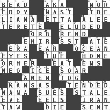 ACROSS 1. Necklace unit 5. Alias (abbr.) 8. And not 11. Whirlpool 12. Political cartoonist Thomas 14. Binary compound 15. Climbing, woody, usually tropical vines 17. Singer James 18. Toward shelter 19. Cylindrical with tapered ends 21. Dodged 23. Globe 25. Tear apart 26. Arab leader 27. Fast jet (abbr.) 28. Had dinner 31. Period 33. Ewer handle 35. Sea 37. Snake ____ (dice throw) 38. Third day of the wk. 40. Dwelling 41. Abalone 43. Erode 45. Followers of ems 46. Modern: prefix 47. Frozen water 50. Fly high 52. So be it 53. Coat; cloak 54. Sunflower state 56. Looked after 61. Grandmother 62. Institutes legal proceedings 65. Lacking originality or spontaneity 66. Night before a holiday 67. Snakelike fish 68. SW Asia republic 69. The 23rd letter of the Hebrew alphabet 70. Pass on 71. Posted DOWN 1. Waist strap 2. Singer Brickell 3. The sixth month of the Jewish calendar 4. Centimeter-gram-second unit of force 5. One (Scot) 6. Krazy ___ of comics 7. Michaelmas daisies 8. "Death on the ____" 9. Wrote a lyric poem 10. Portuguese money of account (variant) 13. Falsehoods 16. Smallest unit of an element 18. Find the sum of 20. 4th largest of the Great Lakes 22. To (old English) 24. Naughty child 26. Relaxation 28. Period of immesurable duration 29. Scottish caps 30. Compass dir. 31. Jane of fiction 32. San ____ (Riviera town) 34. Regret 36. "Mermaids" star 37. Period of immesurable duration 39. 90 degrees 42. Basketball hoops 44. A blast of a horn 48. Desist 49. Followed as a consequence or result 51. Grows older 52. Santa ___, CA 54. Polynesian shrub of the pepper family 55. Afresh 57. Nuclear Threat Initiatives 58. Have the gumption 59. Liveliness 60. Incision 61. Fish or hair follower 63. Connecticut Ivy Leaguer 64. Compass dir.