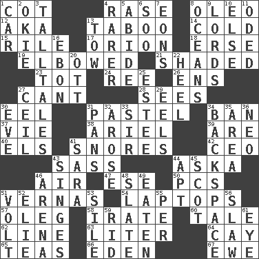 ACROSS 1. Small bed 4. To erase 8. Butter sub 12. Alias (abbr.) 13. Off limits 14. Lacking warmth 15. Cause heat under the collar 17. Greek mythologigal hunter 18. Celtic language 19. Turned at an angle; bent 21. Cast a shadow over 23. Small child 24. Portuguese money of account (variant) 26. Followers of ems 27. Patter 28. Perceives with the eye 30. Snakelike fish 31. Soft color 34. Bar 37. Compete 38. Satellite of Uranus 39. "We ___ not amused" (Victoria) 40. Raised railways 41. Sounds asleep 42. Corporate head (abbr.) 43. Backtalk 44. "____ silly question..." 46. Wind 47. Compass dir. 50. Personal Computers (abbr.) 51. Actresses Bloom and Felton 54. Portable computers 57. Cassini of fashion 58. Feeling or showing extreme anger 60. Story 62. Actor's bit 63. 61 cubic inches 64. Island 65. Afternoon social gatherings 66. Genesis locale 67. She-sheep DOWN 1. Auto 2. Migrant worker of the '30s 3. Baron Munchausen's specialties 4. More uncommon 5. Remain 6. "Barney Miller" actor Jack 7. Immeasurably long periods of time 8. Seas 9. Nobles 10. Otherwise 11. Wrote a lyric poem 13. Pull behind 16. Inky black, to poets 20. Baseball player Mel 22. The bottom of a shoe or boot 25. First name in cosmetics 27. To provide with a ceiling 29. Snakelike fish 30. Night before a holiday 31. Baking dishes 32. Came up 33. Title for a knight 34. Keyboard key 35. Type of rug 36. Modern: prefix 41. "Two Mules for Sister ____" 43. Scorches 44. Fitting 45. Native of Scotland 46. Sports stadium 48. Schedule 49. Eroded 51. Electrical Unit 52. Writer Wiesel 53. Filth; sediment 55. For each 56. Cole _ (cabbage dish) 59. To free from 61. Sight organ