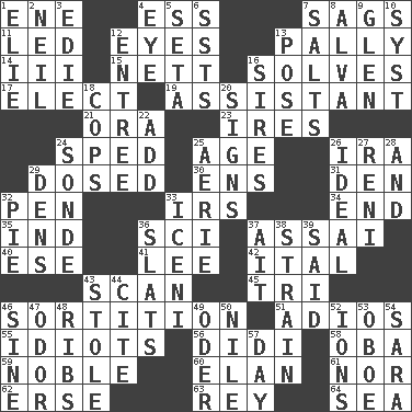 ACROSS 1. Compass dir. 4. Curvy letter 7. Droops 11. Directed 12. Snake ____ (dice throw) 13. Chummy 14. One more than two 15. Remaining after all deductions 16. Finds the solution 17. Opt 19. Aide 21. Mouth or opening 23. Angers 24. Moved rapidly 25. Grow older 26. Lyricist Gershwin 29. Administered medicine 30. Followers of ems 31. Lair 32. Animal enclosure 33. Big collection agency 34. Conclusion 35. Indiana (abbr.) 36. _-fi 37. Slender Brazilian palm 40. Compass dir. 41. Area sheltered from the wind 42. Slanted text style (abbr.) 43. Glance over 45. Three (prefix) 46. Casting lots 51. Goodbye (Sp.) 55. Foolish or stupid persons 56. "You Light Up My Life" star Conn 58. Chief or king in Benin or Nigeria 59. Impressive in appearance 60. Flair 61. And not 62. Celtic language 63. Marina Del _, California 64. Ocean DOWN 1. Writer Wiesel 2. Famous astronaut Armstrong 3. Singer Brickell 4. Sight organ 5. Stalk of a moss capsule 6. Fast planes 7. Table seasonings 8. Inventor's middle name 9. Small, secluded valley 10. System (abbr.) 12. Main course 13. Airs 16. Titles for men of rank and authority 18. 911 reaches them 20. Signals 22. Find the sum of 24. Something which is sent 25. Nest on high 26. Perfect 27. Painter Guido (1575-1642) 28. Plus 29. Lairs 32. Sliced dessert 33. Ancient Celtic tribe of eastern Britain 36. Narrow boards 37. Small island 38. Put through a sieve 39. Alleged 43. Took without asking 44. Quote 46. Trig term 47. Scent 48. Teases 49. Baltic tributary 50. "Death on the ____" 52. Charged atoms 53. Mitch Miller's instrument 54. "Two Mules for Sister ____" 57. 24 hours