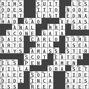 ACROSS 1. Basketball hoops 5. Costume for a special activity 9. French article 12. Lyric poems 13. "Tell ____ the Marines!" 14. Thickened enlargement 15. Portable shelter 16. For fear that 17. Pulitzer Prize-winning author Ferber 18. Possessed 19. E Mali city 21. Viva Las _ 22. Of or related to the anus 24. Medical imaging device (abbr.) 26. Compass dir. 27. Biscuitlike quick bread 28. Greek goddess of the earth (variant) 29. Raised platform 30. Monte _, Las Vegas Hotel/Casino 32. Heavy book 36. Johnson of "Laugh-In" 37. Cartoonist voice _ Blanc 38. At sea 39. Negative votes 40. Collect or gather 42. Agitate 43. Highlander 44. Eroded 46. Raised railways 49. Fenced enclosure 50. So be it 51. Country residence 53. Mouth or opening 54. Arrange properly for use 57. Toward shelter 58. Earth 61. Event that recurs at intervals 62. "You Light Up My Life" star Conn 63. South American Indian 64. Opinion 65. Curvy letter 66. Coral ridge 67. Rendezvous DOWN 1. Writer of Portnoy's Complaint (1969) 2. The main thing one is thinking about 3. Ananias' fault 4. Fast jet (abbr.) 5. Grain storage tower 6. Shoshoni 7. It is 8. Small child 9. Inn 10. Ferber et al. 11. Gospel singer Marvin 14. Born 19. Separate the seeds from cotton 20. Actor Baldwin 21. By way of 23. Olfactory organs 24. Promenades 25. _ de Janeiro 27. "Two Mules for Sister ____" 28. Relatively large 29. Daniel's nick name 31. ID or VA city 32. Clothes sense 33. Clearly or manifestly demonstrative 34. Count _ (2 wds.) 35. Hearing organ 40. Adept person 41. Dry up 43. Health resort 45. Wet nurse (var.) 46. Elude 47. Ms. Damita and namesakes 48. Bobsleighs 52. Luau accessory 53. Norwegian king 55. Singer Brickell 56. Trial 58. Title for a knight 59. Single 60. Frozen water 61. Scottish cap