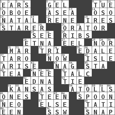 ACROSS 1. Hearing organs 5. Set 8. Third day of the wk. 11. Mitch Miller's instrument 12. At sea 14. Bear (Spanish) 15. Brizilian seaport 17. French philosopher Descartes 18. Angers 19. A viewer who gazes fixedly 21. Speaker 23. Perceive with the eye 25. Chest bones 26. Inactive volcano in Sicily 27. Snakelike fish 28. Or not 31. Make imperfect 33. Three (prefix) 35. Peak District village in England 37. Pacific island yam 38. Immediately 40. Small island 41. Get up 43. Tired old horse 45. R.R. building 46. Afternoon social gathering 47. Born 50. Baby powder 52. Pulitzer Prize-winning author Ferber 53. Neckwear 54. Sunflower state 56. Ringlike coral islands and reefs 61. Singles 62. Adolescent 65. Soup utensil 66. Modern: prefix 67. Otherwise 68. Jacques of French films 69. Car or cant ending 70. Compass dir. 71. Fastener DOWN 1. Immeasurably long periods of time 2. Blind as ____ 3. Round or rotation of duties 4. Dry up 5. Slender fish 6. Compass dir. 7. Poe poem 8. "Corrida" creature 9. One who uses or employs something 10. Greek goddess of the dawn 13. Nest on high 16. For fear that 18. ___ a Wonderful Life 20. Monthly bill 22. Competent 24. Merit 26. Greek god of love 28. Political cartoonist Thomas 29. Rounded earthenware pot or jar 30. To separate or throw off 31. Female horse 32. Operatic vocal solo 34. Electrically charged atom 36. Flat circle 37. Make lace 39. Electrical Unit 42. Conclusions 44. Greek goddess of the earth (variant) 48. Related on the mother's side 49. Artist's stands 51. Allows 52. Followers of ems 54. Leg joint 55. Period of immesurable duration 57. Elects 58. Grant temporary use of 59. Globular water bottle used in Asia 60. Sever or remove by pinching or nipping 61. Single 63. Curvy letter 64. ___ Haven, CT
