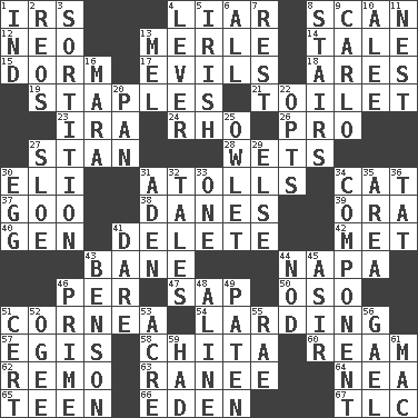 ACROSS 1. Big collection agency 4. One who doesn't tell the truth 8. Examine minutely or intensely 12. Modern: prefix 13. Haggard of country music 14. Story 15. Dormintory (informal) 17. Vices 18. Ancient Greek god of war 19. Paper fasteners 21. Bathroom plumbing fixture 23. Lyricist Gershwin 24. 17th letter of the Greek alphabet 26. Adept person 27. Comedian Laurel of Laurel & Hardy 28. Moistens 30. Connecticut Ivy Leaguer 31. Ringlike coral islands and reefs 34. Domesticated feline 37. Thick or sticky substance 38. Natives or inhabitants of Denmark 39. Mouth or opening 40. Commissioned military rank (abbr.) 41. Keyboard key 42. Was introduced to 43. Object of repulsion 44. California wine valley 46. For each 47. Plant excrement 50. Bear (Spanish) 51. Pupil covering 54. Preparing or cooking with lard 57. Armor plate that protects the chest 58. Riviera of "Kiss of the Spider Woman" 60. 480, 500 or 516 sheets of paper 62. San ____ (Riviera town) 63. Indian princess (variant) 64. Teachers' org. 65. Adolescent 66. Genesis locale 67. Affectionate concern, for short DOWN 1. Working for oneself (abbr.) 2. Vintage cars 3. Drawing lots 4. Prying instrument 5. From or relating to Ireland 6. Everything 7. Remainder 8. Flight of steps 9. Monte _, Las Vegas Hotel/Casino 10. Toward shelter 11. Egg locale 13. Cartoonist voice _ Blanc 16. Hindu Mythology: god of death 20. Baking dish 22. Chooses 25. A small or young owl 27. A type of plum 29. Otherwise 30. Ovum 31. An important port of Yemen 32. Falsehoods 33. Single 34. Piece 35. Type of rug 36. Make lace 41. Have the gumption 43. Gillaume's butler role 44. Allow head to fall sleepily 45. SW Saudi Arabia district 46. A-one 48. Place in a line 49. Eucharist need 51. Sure thing 52. Double curve, resembling the letter S 53. 1/640 square mile 55. Actress Charlotte 56. Highlander 59. Possessed 61. Apple computer (short form)