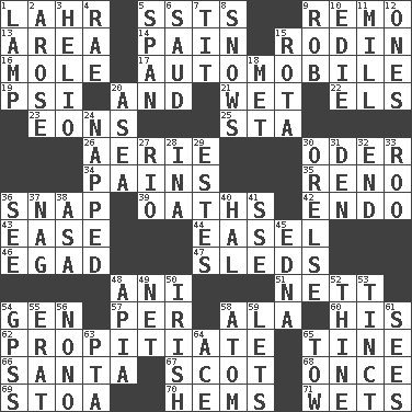 ACROSS 1. Cowardly lion portrayer 5. Fast planes 9. San ____ (Riviera town) 13. Length times width 14. Ache 15. "The Thinker" sculptor 16. Undercover agent 17. Form of transportation 19. 23rd letter of the Greek alphabet 20. Also 21. Dripping 22. Raised railways 23. Immeasurably long periods of time 25. R.R. building 26. Nest on high 30. Baltic tributary 34. Aches 35. Former U.S. Attorney General Janet 36. Fastener 39. Profane or obscene expressions 42. Inside; within (prefix) 43. Comfort 44. Artist's stand 46. Mild oath 47. Bobsleighs 48. Cuckoo 51. Remaining after all deductions 54. Commissioned mil. rank 57. For each 58. Chicken ___ king 60. Part of HMS, perhaps 62. Appease 65. Prong on a fork 66. Before Barbara or Clara 67. Native of Scotland 68. Single time 69. Portico 70. Equivocates 71. Moistens DOWN 1. Desk light 2. Came up 3. Sun: prefix 4. Actress Charlotte 5. Connect, as a bridge 6. Saudi Arabian king (1953-1964) 7. Teat (slang) 8. Overwhelms 9. Director Reiner 10. Singer Brickell 11. Place where flour is made 12. Singles 15. Roll call or roster of names 18. Was introduced to 20. Toward the sea 24. Slept 27. _ de Janeiro 28. _ tizzy (2 wds.) 29. _____ Park, CO 30. Threatening words 31. Lair 32. Conclusion 33. Friend of Pooh 36. Perceive with the eye 37. Tired old horse 38. White ___ sheet 40. Actor Linden 41. Compass dir. 45. Pulitzer Prize-winning author Ferber 48. Capital of Western Samoa 49. Fish or hair follower 50. From or relating to Ireland 52. One or ones belonging to thee 53. Tinged 54. Global Positioning Systems (abbr.) 55. Part of Q.E.F. 56. Words to Nanette 58. Tiny particle 59. Allows 61. Observes 63. Parent Teacher Assoc. 64. Adept person 65. Pull behind