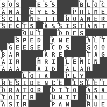 ACROSS 1. Mayday 4. Double-curved letter 7. Group of countries in special alliance 11. Santa ___, CA 12. Snake ____ (dice throw) 13. A-one 14. _-fi 15. Remaining after all deductions 16. Nomad 17. Religious groups 19. Aide 21. Fr. "Yes" 23. Lyric poems 24. Drove too fast 25. A saturated hydrocarbon 26. The first octave above the treble staff 29. Honkers 30. Music discs 31. "Barney Miller" actor Jack 32. Drinking establishment 33. "We ___ not amused" (Victoria) 34. Label 35. Atmosphere 36. Medical imaging device (abbr.) 37. Soviet premier 1918-24 40. Auto club (abbr.) 41. Help 42. Having or resembling wings 43. Globular water bottle used in Asia 45. Travel a route regularly 46. Dwelling 51. Small island 55. Speaker 56. Von Bismarck 58. White ___ sheet 59. Carrier 60. A single undivided whole 61. Actor Linden 62. SW Saudi Arabia district 63. Baking dish 64. Regret DOWN 1. Backtalk 2. At one time in the past 3. Ketch in the Levant 4. Sight organ 5. Bristle 6. Fast planes 7. Naughty children 8. Pale green bean 9. Sign of things to come 10. Certainty 12. Follows as a consequence or result 13. Introduce or present, as a question 16. Amusement-park features 18. Drink excessively 20. Message 22. Binary compound 24. Father Junipero _ 25. Bitter 26. Being in motion 27. Grant temporary use of 28. Coat; cloak 29. Greek goddess of the earth (variant) 32. Sound made by sheep 33. Believer in; advocate of (suffix) 36. Mother 37. Pet locale 38. American author Paul (1891-1958) 39. Negative votes 43. 61 cubic inches 44. Scent 46. Roll call or roster of names 47. Greek god of love 48. Suttee (variant) 49. Clever action or accomplishment 50. Inactive volcano in Sicily 52. Cowardly lion portrayer 53. He sold his birthright 54. Falsehood 57. Shallow baking pan