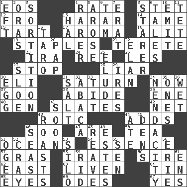 ACROSS 1. Greek goddess of the dawn 4. Pace 8. Proofreading order 12. Back 13. Ethiopian city, capital of Harari 14. Not wild 15. Small pie 17. Scent 18. Came down and settled, as after flight 19. Paper fasteners 21. Cigar-shaped 23. Retirement account (abbr.) 24. To riddle 26. French article 27. Halt 28. One who doesn't tell the truth 30. Connecticut Ivy Leaguer 31. Titan orbits this 34. Cut the grass 37. Thick or sticky substance 38. Remain 39. Compass dir. 40. Commissioned military rank (abbr.) 41. Chalkboards 42. Fish or hair follower 43. College mil. group 44. Sums up 46. "Barney Miller" actor Jack 47. "We ___ not amused" (Victoria) 50. Afternoon social gathering 51. Seas 54. Substance 57. Pate de foie ____ 58. Feeling or showing extreme anger 60. Male parent of an animal 62. 90 degrees 63. Make or become more lively 64. Shallow baking pan 65. Sight organs 66. Lyric poems 67. Affirmative reply DOWN 1. Newt 2. Mouths or openings 3. Decision 4. Less widely known 5. Came up 6. Scottish cap 7. Part of Q.E.F. 8. A viewer who gazes fixedly 9. Falsehoods 10. Give off 11. False hair 13. Actor Linden 16. Edible starchy tuberous root 20. Infant food 22. Enthusiasm 25. Dodge 27. A type of plum 29. Angers 30. Ovum 31. Table seasoning 32. Phillipine bananalike plant 33. Teat (slang) 34. Ananias' fault 35. Singles 36. Dripping 41. Within a short period 43. Ridicules or criticizes harshly 44. Had dinner 45. Habitations of wild animals 46. Gospel singer Marvin 48. Rob, plunder, or pillage 49. _____ Park, CO 51. Double curve, resembling the letter S 52. Supercomputer manufacturer 53. Grain storage tower 55. Elected rep. 56. 4th largest of the Great Lakes 59. To free from 61. Followers of ems
