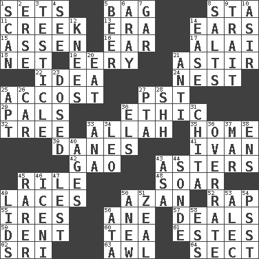 ACROSS 1. Puts into a specified state 5. Container for groceries 8. R.R. building 11. Small stream 13. Epoch 14. Hearing organs 15. NE Netherlands city 16. Ewer handle 17. Mountain range southwest of Kyrgyzstan 18. Fish or hair follower 19. Suggestive of the supernatural 21. Having gotten out of bed 22. The main thing one is thinking about 24. A home for chicks 25. Buttonhole 27. Pacific Standard Time (abbr.) 29. Friends 30. Moral principle 32. Relationship diagram 33. Assad's deity 35. Residence 39. Natives or inhabitants of Denmark 41. _ the terrible 42. E Mali city 43. Michaelmas daisies 45. Cause heat under the collar 48. Fly high 49. Shoestrings 50. Muslim summons to prayer 52. Hit sharply and swiftly 55. Angers 56. A saturated hydrocarbon 57. Allots cards 59. Incision 60. Beverage made from leaves 61. _____ Park, CO 62. Indian title of respect (Mr.) 63. Leather borer 64. Religious group DOWN 1. Glance over 2. Celtic language 3. One of the two male reproductive glands 4. Observe 5. Fermented drink made from hops 6. Like ___ of sunshine 7. Slender fish 8. Table seasonings 9. Distinguishing feature 10. SW Saudi Arabia district 12. Leg joints 14. Comfort 20. Consume 21. Opposed to 23. Administered medicine 25. Fitting 26. Automobile 27. Parent Teacher Assoc. 28. Quiet! 30. Raised railways 31. Riviera of "Kiss of the Spider Woman" 33. Santa ___, CA 34. Lion 36. Make much ado about nothing 37. Make imperfect 38. Followers of ems 40. Eras 43. White ___ sheet 44. Something which is sent 45. More valued for its uncommonness 46. Ancient Celtic tribe of eastern Britain 47. For fear that 49. Hats (slang) 50. Afresh 51. Ardor 53. Actor Baldwin 54. Inconspicuous attention getter 56. _ moment's notice (2 wds.) 58. Double-curved letter