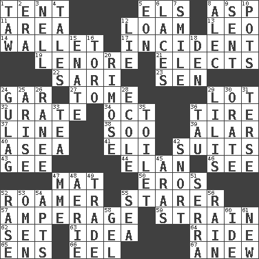 ACROSS 1. Portable shelter 5. Raised railways 8. Cleo's killer 11. Type of rug 12. Rich soil 13. Lion 14. Place for singles 17. Happening 19. Poe poem 21. Chooses 22. Indian skirt 23. Elected rep. 24. Slender fish 27. Heavy book 29. Car dealer's back yard 32. A salt of uric acid 34. Sep. follower 36. Hoop that covers a wheel 37. Actor's bit 38. "Barney Miller" actor Jack 39. Having or resembling wings 40. At sea 41. Connecticut Ivy Leaguer 42. Sets of matching outer garments 43. Turn to the right 44. Flair 46. Perceive with the eye 47. Floor protector 50. Greek god of love 52. Nomad 55. A viewer who gazes fixedly 57. Electrical Measurement 59. Put through a sieve 62. Arrange properly for use 63. The main thing one is thinking about 64. Travel on an animal 65. Followers of ems 66. Snakelike fish 67. Afresh DOWN 1. The 23rd letter of the Hebrew alphabet 2. Period 3. 1994 drama film starring Jodie Foster 4. Stories 5. Period of immesurable duration 6. Shoestrings 7. Grin 8. Actor Baldwin 9. Emitted 10. Cooking vessels 12. Whopper 15. Maternal 16. "Corrida" creature 18. Lair 20. Full of chinks, cracks, or crevices 24. POW camp 25. Ascend 26. The wife of a rajah (variant) 28. Learning spot: Fr. 29. Ms. Damita and namesakes 30. Speak pompously 31. Laconic 33. Afternoon social gathering 35. Bathroom 36. The 19th letter of the Greek alphabet 42. Derisive sound 45. Caspian sea tributary 47. Madame (abbr.) 48. Nest on high 49. Swap 51. Spanish missionary in California 52. Raze (variant) 53. Sign of things to come 54. Flats, for short 55. Ocean 56. Water falling in drops from the sky 58. Set 60. Binary compound 61. ___ Haven, CT