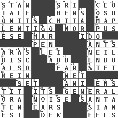 ACROSS 1. Comedian Laurel of Laurel & Hardy 5. _ Lanka 8. Corporate head (abbr.) 11. Story 12. Coop moms 14. Bear (Spanish) 15. Leaves out 17. Riviera of "Kiss of the Spider Woman" 18. Atlas unit 19. Small, flat, pigmented spot on the skin 21. Or not 22. Festering 23. Compass dir. 24. Spoil 25. Wedding promise 27. Fenced enclosure 28. Pismires 31. Caspian sea tributary 35. Luau accessory 37. Famous astronaut Armstrong 38. Flat circle 39. Say or write further 41. Inside; within (prefix) 42. In addition 43. Hearing organ 45. Proofreading order 46. Count _ (2 wds.) 47. Was introduced to 49. Put into a specified state 51. Cuckoo 52. Followers of ems 55. Teat (slang) 57. It is 60. Commissioned military rank 62. Mouth or opening 63. Annoying sound 65. Before Barbara or Clara 66. "___ Little Indians" 67. Hearing organs 68. Thailand, formerly 69. Eastern Standard Time (abbr.) 70. Morning condensation 71. Snakelike fish DOWN 1. Took without asking 2. Makes less strong or intense 3. Place in a line 4. Remaining after all deductions 5. Quiet! 6. It's straight from the horse's mouth 7. To the inside or interior of 8. Piece 9. He sold his birthright 10. I made a mistake 13. Indian skirt 16. Simple or foolish person 17. Pupil covering 20. Highlander 26. Natives or inhabitants of Denmark 29. Event that recurs at intervals 30. Narrow, elongated depression 31. First man 32. Cause heat under the collar 33. Helper 34. Biscuitlike quick bread 36. Binary compound 40. Break 44. French philosopher Descartes 48. Metal containers 50. Prong on a fork 52. Bert's buddy 53. Brizilian seaport 54. Hits or strikes with great force 55. Carry 56. Angers 58. Frog relative 59. The founder of a family 61. Comfort 64. Compass dir.