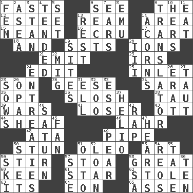 ACROSS 1. Goes without food and/or water 6. Perceive with the eye 9. Definite Article 12. First name in cosmetics 13. 480, 500 or 516 sheets of paper 14. Type of rug 15. Intended 16. Shade of tan 17. Heavy open wagon 18. Also 19. Fast planes 20. Charged particles 21. Give off 23. Big collection agency 24. Prepare for publication 25. An arm off of a larger body of water 28. Male child 30. Honkers 34. "Two Mules for Sister ____" 35. Choose 36. Agitate, as a liquid 38. The 19th letter of the Greek alphabet 39. Armed conflicts 41. Failure 43. Baseball player Mel 44. Archer's quiver 46. Cowardly lion portrayer 48. "One Day ___ Time" 49. Corncob 50. Surprise greatly 51. Margarine 53. Nonscientific branch of learning 56. Agitate 57. Portico 58. Relatively large 60. Peachy ____! 61. Play the lead 62. Fur scarf 63. It is 64. A really long time 65. NE Netherlands city DOWN 1. Opposite of masc. 2. Toward the sea 3. Comedian Laurel of Laurel & Hardy 4. Looked after 5. Arrange properly for use 6. Religious group 7. Hearing organs 8. Australian flightless bird 9. Interpreter 10. Possessive pronoun 11. Erode 13. Remainder 14. Oak nuts 19. Settings 20. One more than two 22. Russian fighter aircraft 24. Pleas 26. Part of Q.E.F. 27. Pulled tight 28. Sty mamas 29. Brightly colored fish 31. Pipe bend 32. "Barney Miller" actor Jack 33. Double-curved letter 37. Sun: prefix 40. Titan orbits this 42. Hit sharply and swiftly 45. Air blower 47. Centers of feelings and intuitions 49. Lightbulb-shaped fruit 50. Proofreading order 51. "Beetle Bailey" pooch 52. Grant temporary use of 54. Vintage cars 55. Story 56. What Jean-Claude Killy likes to do 57. Compass dir. 58. Girls' org. (abbr.) 59. Nine, plus one
