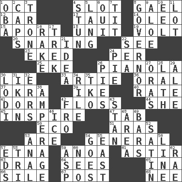 ACROSS 1. Sep. follower 4. Groove 8. Highlander 12. Drinking establishment 13. "Change" in Tahitian 14. Margarine 15. To the left, to Queeg 18. A single undivided whole 19. Electrical Unit 20. Catching in a trap 22. Observe 23. Made supply last 24. For each 25. Supplement with great effort 26. Player piano 30. Untruth 33. Nick name for Arthur 36. Taken by mouth 37. Gumbo ingredient 39. Mamie's mate 40. Assign a rank or rating to 41. Dormintory (informal) 42. Soft thread for cleaning between teeth 44. A female animal or person 45. Stimulate to action 47. Bar bill 50. Environmental prefix 51. Ancient river in northeast Turkey 53. "We ___ not amused" (Victoria) 54. Commissioned military rank 57. Inactive volcano in Sicily 59. Small Philippine buffalo 61. Having gotten out of bed 63. To trail on the ground 64. Observes 65. _ tizzy (2 wds.) 66. Drop; flow; fall 67. Mail 68. Born DOWN 1. Chief or king in Benin or Nigeria 2. Smile enhancers 3. Marketplace scale 4. Make senseless or dizzy 5. Long (Scottish) 6. Fr. "Yes" 7. Teat (slang) 8. State head 9. Medicinal plant 10. Snakelike fish 11. Car dealer's back yard 16. Immoral or dissolute person 17. Long journey 21. The main thing one is thinking about 22. Ocean 24. Sliced dessert 26. Sliced desserts 27. Mouths or openings 28. Thin strip of wood or metal 29. Toward shelter 30. Farming town in central California 31. Visual representation of an object 32. Blunders 34. Cause heat under the collar 35. Ring climax 38. Electrical Measurement 42. From 43. Comedian Laurel of Laurel & Hardy 46. Frozen water 48. Length times width 49. Drinking establishments 52. Smooth fabric 53. Of or related to the anus 54. Leaves 55. 90 degrees 56. Actor's bit 57. Begley and Asner 58. Three (prefix) 59. Cleo's killer 60. Modern: prefix 62. Actress Charlotte