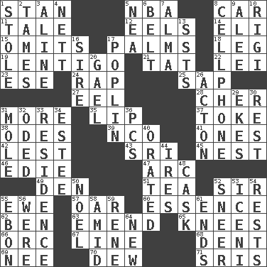 ACROSS 1. Comedian Laurel of Laurel & Hardy 5. Basketball assoc. 8. Automobile 11. Story 12. Snakelike fish 14. Connecticut Ivy Leaguer 15. Leaves out 17. Insides of hands 18. Part of a journey 19. Small, flat, pigmented spot on the skin 21. Make lace 22. Flowery wreath 23. Compass dir. 24. Hit sharply and swiftly 25. Plant excrement 27. Snakelike fish 28. "Mermaids" star 31. Greater amount 35. Mouth edge 37. Puff or smoke 38. Lyric poems 39. Non-commissioned officer (abbr.) 41. Singles 42. For fear that 43. _ Lanka 45. A home for chicks 46. Singer Brickell 47. Curve 49. Lair 51. Afternoon social gathering 52. Title for a knight 55. She-sheep 57. Boat paddle 60. Center 62. Benjamin's nick name 63. Make improvements or corrections to 65. Leg joints 66. The grampus (Milton) 67. Actor's bit 68. Gouge 69. Born 70. Morning condensation 71. Indian titles of respect DOWN 1. Fur scarf 2. Softens 3. Place in a line 4. Remaining after all deductions 5. Teachers' org. 6. Waist strap 7. _ mater 8. Portable communications device 9. Toward shelter 10. Swiss mountan, "Queen of the Mountains" 13. Fast planes 16. Beget 17. Cotton for raincoats, e.g. 20. Highlander 26. Gambison 29. Supplements with great effort 30. Take ten 31. Undercover agent 32. Wrote a lyric poem 33. Dwelling 34. First name in cosmetics 36. Personal Computers (abbr.) 40. Spoke pompously 44. Angers 48. Keg 50. Christmas carol 52. Contemptuous expression 53. Ancient Celtic tribe of eastern Britain 54. Musical pauses 55. Inky black, to poets 56. Past tense of be (plural) 58. Among 59. French philosopher Descartes 61. Conclusions 64. ___ Haven, CT