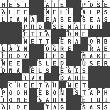 ACROSS 1. Behest 5. Had dinner 8. Airs 12. Toward shelter 13. Not ill 15. High mountains 16. Climbing, woody, usually tropical vines 18. Relaxation 19. Oceans 20. Adept person 22. Legislator 24. Singer James 26. Single 27. Remaining after all deductions 28. Period 29. Globe 32. (Had) reclined 35. Legendary monster 37. Actress Charlotte 38. Whirlpool 39. Lion 40. Cause to be 41. Born 42. Downhill vehicle 43. One who uses or employs something 44. Heredity factor (abbr.) 45. Raised railways 46. Armor plate that protects the chest 49. Federal power corp. 50. Have the gumption 51. Leopard's kin 55. Fish or hair follower 56. "Silly old bear" 57. Inky black, to poets 59. Staphylococcus 63. Heavy book 64. "Two Mules for Sister ____" 65. Needle case 66. Medicinal plant 67. Label 68. Backtalk DOWN 1. Actor Linden 2. Biblical high priest 3. Ocean 4. 3-inch nail 5. Deep reverence 6. Beverages made from leaves 7. Otherwise 8. Thick mixture 9. Butter sub 10. Practice fight 11. Curvy letter 14. Poe poem 17. Johnson of "Laugh-In" 21. Baseball player Mel 23. Santa ___, CA 25. Ringlike coral islands and reefs 28. Eaten away 29. Mouths or openings 30. Immoral or dissolute person 31. Fermented drink made from hops 32. Grant temporary use of 33. An important port of Yemen 34. The main thing one is thinking about 36. Unit of force equal to gravity 40. French bagpipes 42. Chalkboards 45. First lady 47. Separate the seeds from cotton 48. Angers 49. Giggle 51. Calm and collected 52. Same (prefix) 53. Blind as ____ 54. Israeli folk dance 56. Parent Teacher Assoc. 58. Tired old horse 60. "One Day ___ Time" 61. Ichor 62. Part of HMS, perhaps