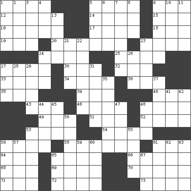 ACROSS 1. Secret move to avoid paying debts 5. Oceans 9. "Barney Miller" actor Jack 12. "The Thinker" sculptor 14. Legendary monster 15. Russian fighter aircraft 16. Spew [out] 17. Louse (plural) 18. 100% 19. Lair 20. Consume 23. Celtic language 24. Russian ruler of old 25. A distinct part 27. Root beer relative 30. Infant food 32. 4-wheeled motor vehicle 33. Blind as ____ 34. Capital of Western Samoa 36. Color 38. Scottish cap 39. Followers of ems 40. Directed 43. Fluid product of inflammation 46. Puts into a specified state 48. Grain storage tower 49. HTML Container Element 51. Slangy assent 52. Equivocates 53. Have the gumption 54. To erase 56. Christmas carol 58. Ridicules or criticizes harshly 61. Pacific Standard Time (abbr.) 64. Baseball player Mel 65. Of or related to the anus 66. Grayish beige 68. Shoshoni 69. Nathan's nickname 70. Grain storage towers 71. Not either 72. American tennis player Robert 73. Remaining after all deductions DOWN 1. Flintstone 2. Old wives' tales, e.g. 3. Goddess of spring and wife of Bragi 4. Nervous spasm 5. Flatfish 6. The front part of a cuirass 7. Northern region 8. Observe 9. Excessive but superficial compliments 10. Petroleums 11. Stare at amorously 13. Nuclear Threat Initiatives 21. California wine valley 22. Wine fruits 23. Suggestive of the supernatural 24. Make lace 26. Bit 27. Feline 28. Chief or king in Benin or Nigeria 29. Desk light 31. Abounding in pines 35. Michaelmas daisies 37. Writer Wiesel 41. Shade tree 42. Two (Sp.) 44. Allodial 45. Title for a knight 47. Petty quarrel 48. A female animal or person 50. Actresses Bloom and Felton 53. Prevent from occurring 55. Fast planes 56. Part of speech 57. "Beetle Bailey" pooch 59. Pledge 60. Toward shelter 61. Whimper 62. Blemish 63. Trial 65. Santa ___, CA 67. The 18th letter of the Arabic alphabet