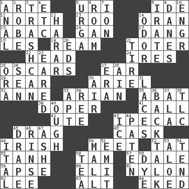 ACROSS 1. Johnson of "Laugh-In" 5. RI univ. 8. Binary compound 11. _ pole 13. Friend of Pooh 14. Northwest Algerian city 15. Phillipine bananalike plant 16. Separate the seeds from cotton 17. Mild oath, euphamism for damn 18. French article 19. 480, 500 or 516 sheets of paper 21. Carrier 22. Froth on beer 24. Angers 25. Motion picture awards 27. Hearing organ 29. Buttocks 30. Satellite of Uranus 32. Queen of England 1702-14 33. Believer in; advocate of (suffix) 35. Blind as ____ 39. Drug addict 41. Give a ring to 42. Shoshoni 43. Medicinal drug used to evoke vomiting 45. To trail on the ground 48. Keg 49. From or relating to Ireland 50. Confront 52. Make lace 55. Hyperbolic tangent 56. Scottish cap 57. Peak District village in England 59. Domed church section 60. Biblical high priest 61. High-strength synthetic material 62. Area sheltered from the wind 63. Keyboard modifier key 64. Supplemented with great effort DOWN 1. Of or related to the anus 2. Loose flowing garment 3. File 13 4. And so on (abbr.) 5. Capital and largest city of Mongolia 6. Wander 7. Electrically charged atom 8. Feeling or showing extreme anger 9. Natives or inhabitants of Denmark 10. Engineer (abbr.) 12. Ethiopian city, capital of Harari 14. Scent 20. Begley and Asner 21. Become fatigued 23. Having ears or earlike features 25. Mouth or opening 26. Elected rep. 27. Period 28. The 18th letter of the Arabic alphabet 30. Atmosphere 31. Shoestrings 33. Fitting 34. To separate or throw off 36. Sass 37. In the manner of 38. Affectionate concern, for short 40. Ending for "Through" and "Enough" 43. Frozen water 44. Eucharist need 45. Window treatment 46. Remove soap 47. American tennis player Robert 49. Slanted text style (abbr.) 50. Promenade 51. Give off 53. Medicinal plant 54. Watch over 56. Afternoon social gathering 58. Color
