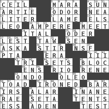 ACROSS 1. To provide with a ceiling 5. Hindu Mythology: god of death 9. Player for Phoenix 12. Nick name for Arthur 14. Aroma 15. Teachers' org. 16. 61 cubic inches 17. Unable to walk 18. Raised railways 19. Lion 20. Electrical Unit 23. Confront 24. Slanted text style (abbr.) 25. River in Europe 27. For fear that 30. The 23rd letter of the Hebrew alphabet 32. Elected rep. 33. "____ silly question..." 34. Agitate 36. Science/research agcy. 38. Parent Teacher Assoc. 39. Period 40. One more than two 43. Three (prefix) 46. Puts into a specified state 48. Coalition 49. Followers of ems 51. River (Sp.) 52. French philosopher Descartes 53. Southwest Nigerian state 54. Butter sub 56. Frog relative 58. Pressed 61. Long, evenly shaped piece 64. Big collection agency 65. Having or resembling wings 66. Empty; void 68. Actress Charlotte 69. Bristle 70. Portable shelters 71. Double-curved letter 72. An important port of Yemen 73. Trial DOWN 1. Give a ring to 2. 4th largest of the Great Lakes 3. "Tell ____ the Marines!" 4. Whopper 5. Undercover agent 6. The sixth month of the Jewish calendar 7. Lover boys 8. "We ___ not amused" (Victoria) 9. Contemptuous expression 10. Ubangi River tributary 11. Political cartoonist Thomas 13. Part of Q.E.F. 21. Floor protectors 22. Food holders 23. Not women's 24. Call ___ day 26. Lair 27. Pet locale 28. Eastern Standard Time (abbr.) 29. Three-handed card game 31. One who wires 35. Food allowance for one day 37. Do some clerical work 41. Electrically charged atom 42. Frozen water 44. Tear apart 45. Working for oneself (abbr.) 47. Not divided or shared with others 48. Sis' sibling 50. Dirtied 53. Fertile tracts in a desert 55. Prepare for publication 56. Hoop that covers a wheel 57. Mouths or openings 59. Pace 60. Northwest Algerian city 61. Object of repulsion 62. Pismires 63. Repose 65. White ___ sheet 67. Fish or hair follower