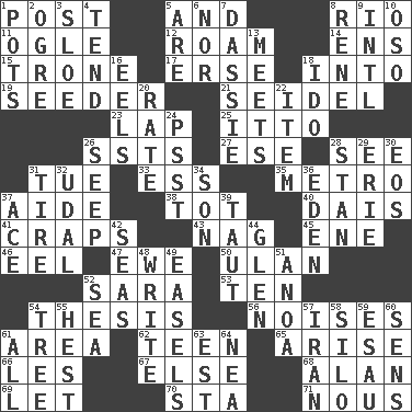 ACROSS 1. Mail 5. Plus 8. _ de Janeiro 11. Stare 12. Wander 14. Followers of ems 15. Heavy duty weighing machine 17. Celtic language 18. To the inside or interior of 19. Sowing specialist 21. A glass for beer 23. Pet locale 25. "Tell ____ the Marines!" 26. Fast planes 27. Compass dir. 28. Observe 31. Third day of the wk. 33. Double-curved letter 35. Paris' subway 37. Helper 38. Small child 40. Raised platform 41. Dice game 43. Tired old horse 45. Compass dir. 46. Snakelike fish 47. She-sheep 50. ____ Bator, Mongolia 52. "Two Mules for Sister ____" 53. Nine, plus one 54. College paper 56. Annoying sounds 61. Type of rug 62. Adolescent 65. Ascend 66. French article 67. Otherwise 68. ____ Jay Lerner 69. Allow 70. R.R. building 71. Common sense DOWN 1. Plant holders 2. Legendary monster 3. A type of plum 4. Look after 5. "We ___ not amused" (Victoria) 6. Or not 7. Hyrax 8. French philosopher Descartes 9. International (abbr.) 10. Bear (Spanish) 13. Confronts 16. Snakelike fish 18. Wedding promise 20. Assign a rank or rating to 22. A whole individual unit 24. Inconspicuous attention getter 26. Ooze 28. Comedian Laurel of Laurel & Hardy 29. 4th largest of the Great Lakes 30. Greek goddess of the dawn 31. Hoop that covers a wheel 32. Freehold land 34. Male child 36. Paradise 37. Adept person 39. Tense 42. Oceans 44. Small, secluded valley 48. Compose 49. Artist's stands 51. Small Philippine buffalo 52. Ocean 54. Woody plant 55. Command 57. SW Asia republic 58. Grain storage tower 59. Son of Isaac 60. Elected reps. 61. 100% 63. Eastern Standard Time (abbr.) 64. Teachers' org.