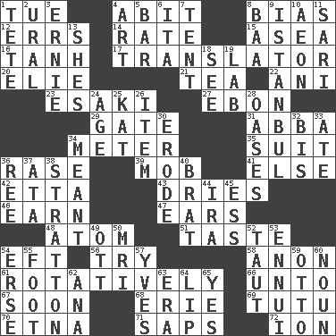 ACROSS 1. Third day of the wk. 4. "This won't hurt ____!" 8. Prejudice 12. Blunders 14. Pace 15. Toward the sea 16. Hyperbolic tangent 17. Interpreter 20. Writer Wiesel 21. Afternoon social gathering 22. Cuckoo 23. 1973 Nobel Price Winner (Physics) Leo 27. Inky black, to poets 29. Yard entry 31. Swedish rock group 34. Distance measurement 35. Set or collection 36. Raze (variant) 39. Crowd into 41. Otherwise 42. Singer James 43. Frees from moisture 46. Merit 47. Hearing organs 48. Tiny particle 51. Clothes sense 54. Bank Draft (abbr.) 56. Attempt to accomplish something 58. Soon (poet.) 61. Producing rotation 66. To (old English) 67. Within a short period 68. 4th largest of the Great Lakes 69. Ballerina skirt 70. Inactive volcano in Sicily 71. Plant excrements 72. Electrically charged atom DOWN 1. Wig 2. Mountain range 3. Bert's buddy 4. Nonscientific branch of learning 5. Drinking establishment 6. Call ___ day 7. Portable shelter 8. Sound made by sheep 9. Byzantium, centuries later 10. Period of immesurable duration 11. Indian skirt 13. "______ My Girl" (Turtles hit) 18. Perceive with the eye 19. Experiment locale 24. Grow older 25. Krazy ___ of comics 26. A distinct part 28. Fertile tracts in a desert 30. Wear away 32. Again 33. Had dinner 34. Intended 36. To riddle 37. _ moment's notice (2 wds.) 38. Ski resort town in Vermont 40. Naughty child 44. Lyricist Gershwin 45. Curvy letter 49. Baseball player Mel 50. Medical imaging device (abbr.) 52. Pulled tight 53. World-weariness 54. Celtic language 55. Lowest support of a structure 57. Jacques Cousteau's middle name 59. Von Bismarck 60. Part of speech 62. Santa ___, CA 63. Epoch 64. Mouth edge 65. It is so