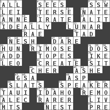 ACROSS 1. Everything 4. Observes 8. Compass dir. 11. Flowery wreath 12. Laconic 14. Nathan's nickname 15. Singer Murray 17. Feeling or showing extreme anger 18. Set down 19. Under perfect conditions 21. Type of eclipse 23. Actress Charlotte 24. Small boy 25. Tender 27. Have the gumption 30. Attila the _ 31. Full of chinks, cracks, or crevices 34. Two (Sp.) 37. Increase 38. Drinks excessively 39. Mamie's husband 40. Lion 41. Cause to be 43. Be seated 44. "Mermaids" star 45. American tennis player Robert 47. Girls' org. (abbr.) 49. Viper 50. Narrow boards 52. Orator 56. "Change" in Tahitian 57. Potato state 60. San ____ (Riviera town) 61. Actor Baldwin 62. More uncommon 63. 54 in ancient Rome 64. Mountains (abbr.) 65. Egg locale 66. Before (prefix) DOWN 1. Jai _ 2. Grant temporary use of 3. Actor's bit 4. Vertical member of a panel or frame 5. Suggestive of the supernatural 6. Period 7. Fast jet (abbr.) 8. Vegetable dish 9. Move through with a circular motion 10. Dripping 13. Snakelike fish 14. Nanny 16. Hearing organs 20. Cowardly lion portrayer 22. Shoshoni 25. Unadorned 26. Inside; within (prefix) 27. Drug addict 28. At sea 29. Relief 30. Actor Linden 32. Hankering 33. Greater amount 34. Food container 35. Migrant worker of the '30s 36. Arrange properly for use 42. Comfort 44. Domesticated feline 46. Practice fight 47. Cements 48. Ketch in the Levant 49. To the left, to Queeg 50. Table seasoning 51. Title for a knight 52. "______ My Girl" (Turtles hit) 53. Seaweed 54. Independent ruler or chieftain 55. Be footloose 56. Scottish cap 58. One of the 12 tribes of Israel 59. "We ___ not amused" (Victoria)