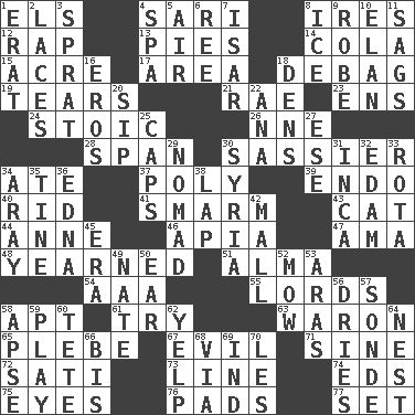 ACROSS 1. Raised railways 4. Indian skirt 8. Angers 12. Strike 13. Sliced desserts 14. Root beer relative 15. Measure of real estate 17. Length times width 18. Debunk (Brit. slang) 19. Rends 21. Actress Charlotte 23. Followers of ems 24. Unemotional 26. Compass dir. 28. Connect, as a bridge 30. More disrespectful 34. Had dinner 37. Many (prefix) 39. Inside; within (prefix) 40. To free from 41. Excessive but superficial compliments 43. Domesticated feline 44. Singer Murray 46. Capital of Western Samoa 47. Housemaid (var.) 48. Had a strong desire 51. _ mater 54. Auto club (abbr.) 55. Titled peers of a realm 58. Fitting 61. Attempt 63. Make _____ (do battle with) 65. First-year military academy student 67. Morally bad or wrong 71. Trig term 72. Suttee (variant) 73. Actor's bit 74. Begley and Asner 75. Snake ____ (dice throw) 76. Groovy apts. 77. Put into a specified state DOWN 1. Part of Q.E.F. 2. Shoestrings 3. Small fatty European fish 4. Health resort 5. Wind 6. To riddle 7. Austrian river, tributary to the Danube 8. Frozen water 9. Loose flowing garment 10. Enthusiasm 11. Settles 16. Greek god of love 18. Habitations of wild animals 20. Small drink 22. Santa ___, CA 25. Balmoral and tarboosh 27. Compass dir. 29. Wanderer 30. Damascus' land 31. South American Indian 32. Dutch treat 33. Roll call or roster of names 34. Like ___ of sunshine 35. Prong on a fork 36. Pulitzer Prize-winning author Ferber 38. Pet locale 42. Shopping center 45. Epoch 49. Nathan's nickname 50. Ewer handle 52. Cut the grass 53. Caspian sea tributary 56. Frees from moisture 57. Message 58. Domed church section 59. Romp 60. Wig 62. Sharp bark 64. A home for chicks 66. Altar cloth linen 68. By way of 69. Working for oneself (abbr.) 70. French article