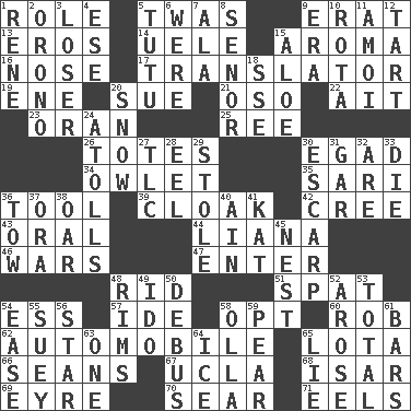 ACROSS 1. Hero or heavy, e.g. 5. It was, poetically 9. Part of Q.E.F. 13. Greek god of love 14. Ubangi River tributary 15. Scent 16. Sense of smell 17. Interpreter 19. Compass dir. 20. Institute legal proceedings 21. Bear (Spanish) 22. Small island 23. Northwest Algerian city 25. Portuguese money of account (variant) 26. Lugs 30. Mild oath 34. A small or young owl 35. Indian skirt 36. Instrument 39. Anything that covers or conceals 42. Algonquian 43. Of the mouth 44. Woody, climbing, usually tropical plant 46. Armed conflicts 47. Keyboard key 48. To free from 51. Petty quarrel 54. Curvy letter 57. Binary compound 58. Choose 60. Director Reiner 62. Form of transportation 65. Globular water bottle used in Asia 66. Actors Connery and Penn 67. Southern CA. univ. 68. Austrian river, tributary to the Danube 69. Jane of fiction 70. Singe 71. Snakelike fish DOWN 1. French philosopher Descartes 2. U. of Maine site 3. Failure 4. Compass dir. 5. Ballerina skirt 6. Past tense of be (plural) 7. In the manner of 8. Sir (Sp.) 9. Period 10. Roll call or roster of names 11. Mine, in Marseilles 12. Small pie 15. _ vera 18. Compass dir. 20. Frozen precipitation 24. Ringlike coral islands and reefs 27. Affectionate concern, for short 28. Snakelike fish 29. Took without asking 30. Fortification 31. Slender fish 32. "We ___ not amused" (Victoria) 33. Expire 36. Pull behind 37. Mouth or opening 38. Rowing implement 40. The 18th letter of the Arabic alphabet 41. Krazy ___ of comics 45. Egg locale 48. Basketball hoops 49. Wedding promise 50. Alight from a bus 52. Came up 53. "_____ Recall" 54. Relaxation 55. Chop _ 56. Play the lead 58. Rounded earthenware pot or jar 59. Lightbulb-shaped fruit 61. Soap units 63. Single 64. Frozen water 65. Untruth